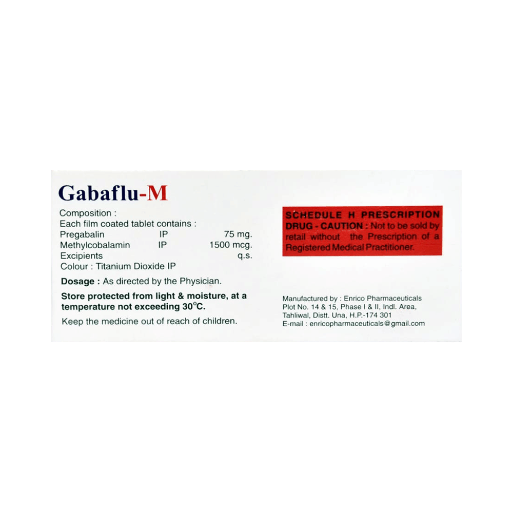 Gabaflu-M Tablet is a prescription medicine used for the treatment of neuropathic pain. It decreases pain by modulating the calcium channel activity of the nerve cells. This medicine also protects nerve fibers and heals damaged nerve cells. Gabaflu-M Tablet may be taken with or without food, preferably at bedtime. It is advised to take it at the same time each day as this helps to maintain a consistent level of medicine in the body. Take this medicine in the dose and duration advised by your doctor. If you miss a dose of this medicine, take it as soon as you remember. Finish the full course of treatment even if you feel better. This medication must not be stopped suddenly without talking to the doctor.Some common side effects of this medicine include nausea, vomiting, diarrhea, constipation, blurred vision, dizziness, and sleepiness. Do not drive or do anything that requires mental focus until you know how this medicine affects you. The side effects are mild and usually improve with time. It may also cause weight gain in some people. Exercise regularly and have a balanced diet to keep your weight in check. Inform your doctor if you develop any unusual changes in mood or behavior, new or worsening depression, or suicidal thoughts.Your doctor should also know about all other medicines you are taking, as many of these may make this medicine less effective or change the way it works. Inform your doctor if you are pregnant, planning pregnancy, or breastfeeding to make sure it is safe for you and the developing baby.