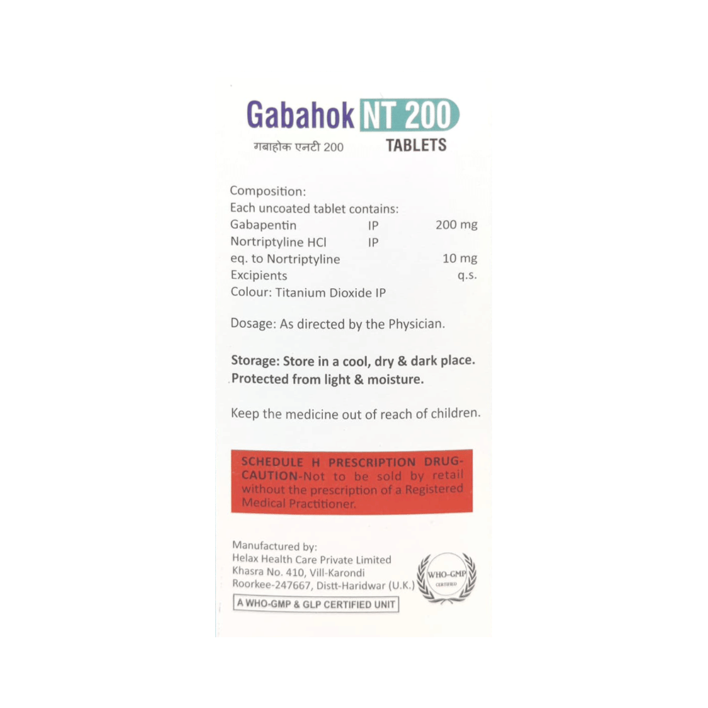 Gabahok NT 200 Tablet is a combination medicine used for the treatment of neuropathic pain. This medicine decreases the pain by stopping the movement of pain signals to the brain. Gabahok NT 200 Tablet is taken by mouth, with or without food and preferably at night. It is advised to take it at a fixed time each day to maintain a consistent level of medicine in the blood. In case you miss a dose of this medicine, take it as soon as you remember. Finish the full course of treatment even if you feel better. It is important not to stop taking this medicine suddenly without talking to the doctor as it may worsen your symptoms.Some common side effects of this medicine constipation, difficulty in urination, weight gain, tiredness, and dryness in mouth. It may also cause dizziness and sleepiness, so do not drive or do anything that requires mental focus until you know how this medicine affects you. This medicine may cause weight gain and to control it, you should exercise regularly and take a balanced diet. Remember to inform the doctor if you develop any unusual changes in mood as this medicine may lead to suicidal thoughts.Before taking this medicine let your doctor know if you suffer from kidney or liver disease. Your doctor should also know about all other medicines you are taking as many of these may make this medicine less effective or change the way it works. Inform your doctor if you are pregnant, planning pregnancy or breastfeeding.