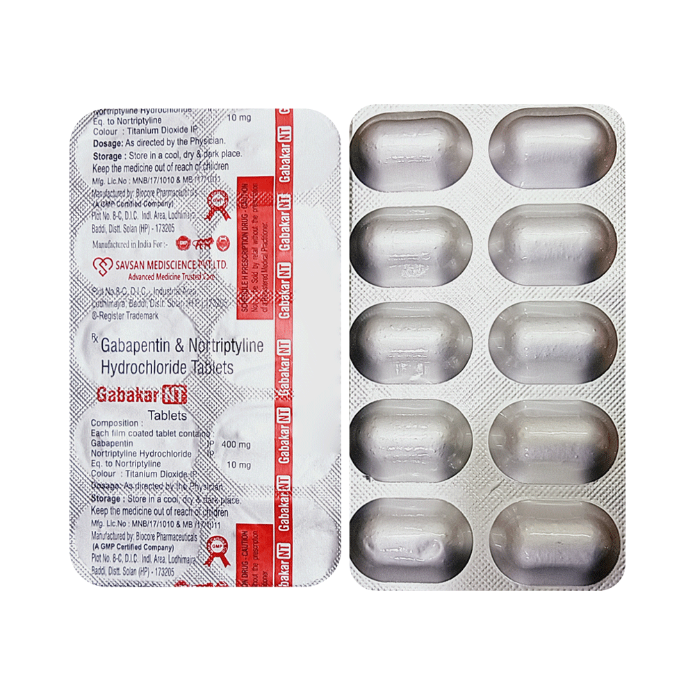 Gabakar NT Tablet is a combination of two medicines: Gabapentin and Nortriptyline. Gabapentin is an alpha 2 delta ligand which decreases the pain by modulating calcium channel activity of the nerve cells. Nortriptyline is a tricyclic antidepressant which increases the levels of chemical messengers (serotonin and noradrenaline) that stop the movement of pain signals in the brain. Together, they relieve neuropathic pain (pain from damaged nerves).