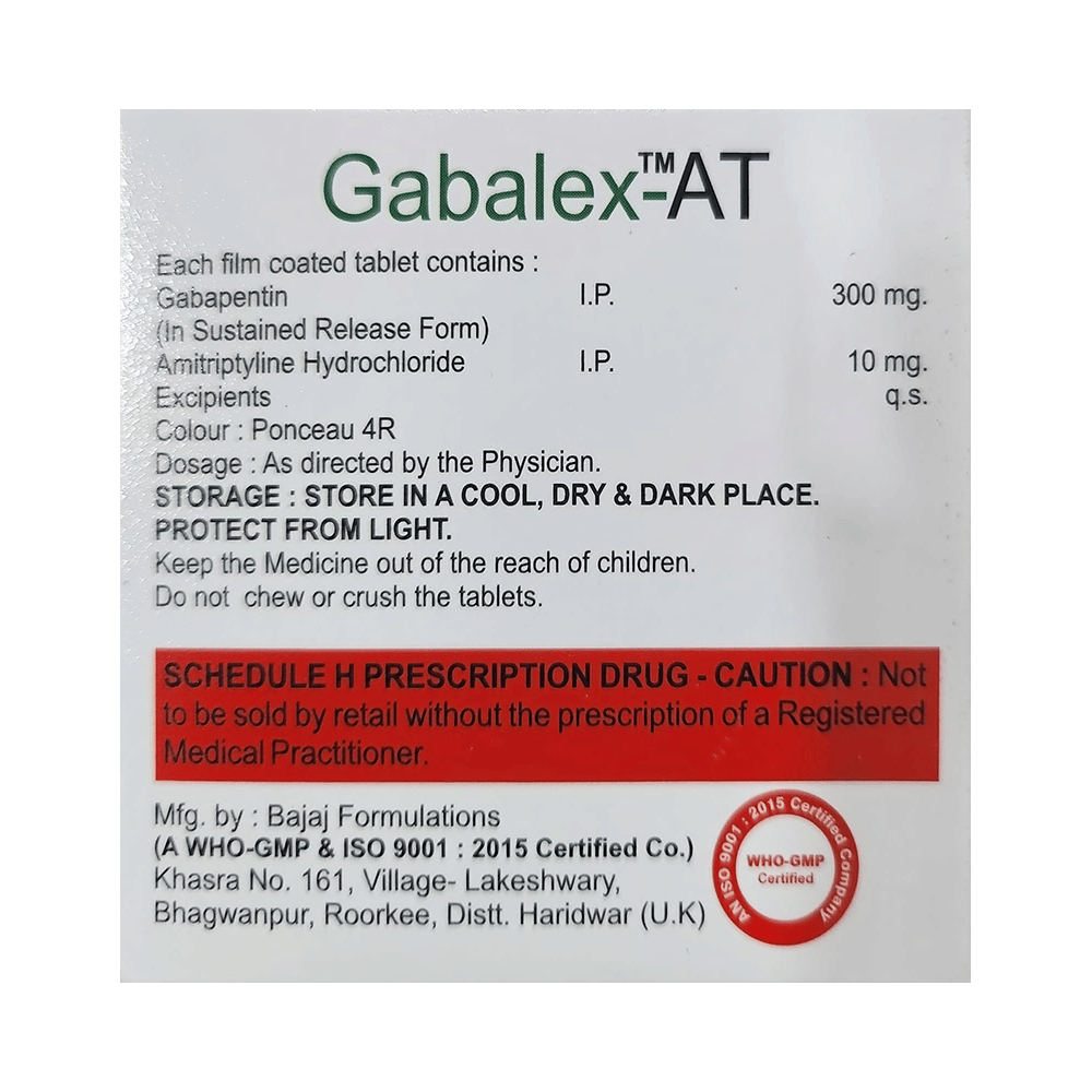 Gabalex-AT Tablet SR is a combination of two medicines: Gabapentin and Amitriptyline. Gabapentin is an alpha 2 delta ligand which decreases the pain by modulating calcium channel activity of the nerve cells. Amitriptyline is a tricyclic antidepressant which increases the levels of chemical messengers (serotonin and noradrenaline) that stop the movement of pain signals in the brain. Together, they relieve neuropathic pain (pain from damaged nerves).
