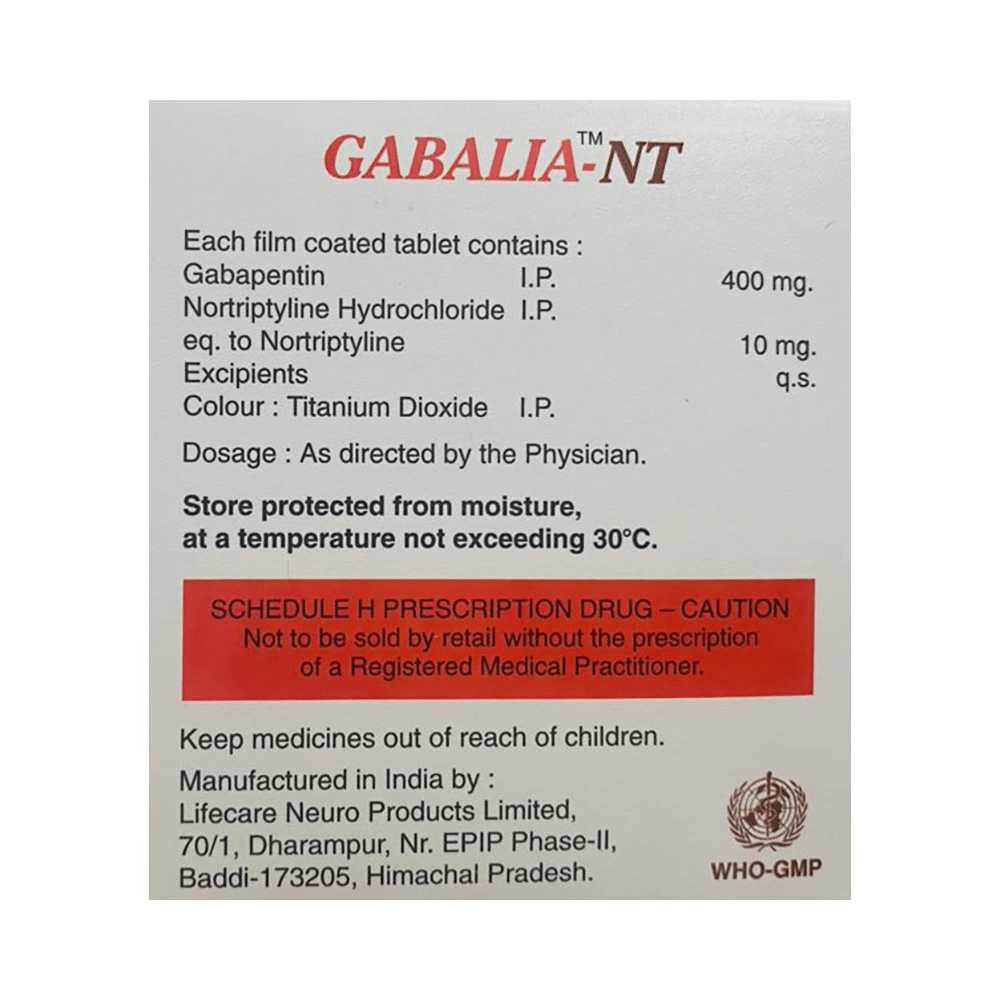 Gabalia-NT Tablet is a combination of two medicines: Gabapentin and Nortriptyline. Gabapentin is an alpha 2 delta ligand which decreases the pain by modulating calcium channel activity of the nerve cells. Nortriptyline is a tricyclic antidepressant which increases the levels of chemical messengers (serotonin and noradrenaline) that stop the movement of pain signals in the brain. Together, they relieve neuropathic pain (pain from damaged nerves).