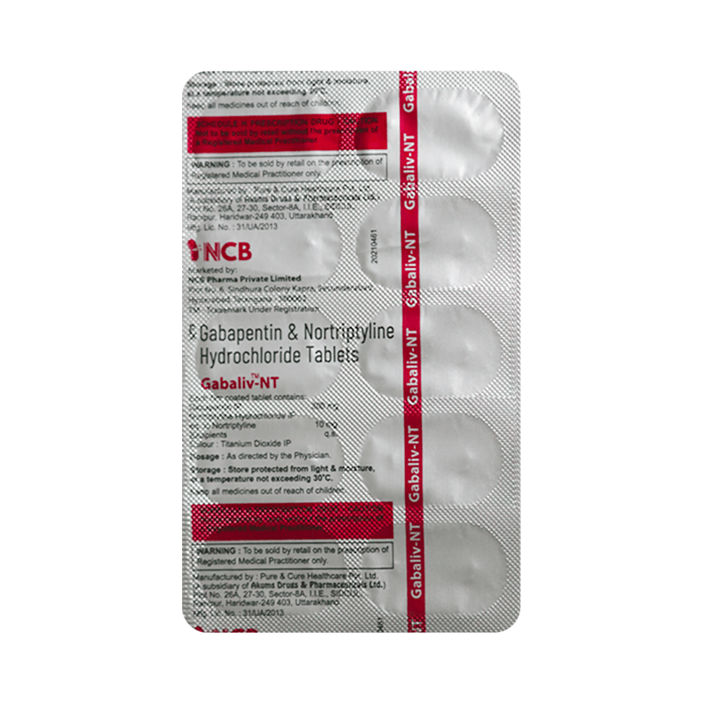Gabaliv-NT Tablet is a combination of two medicines: Gabapentin and Nortriptyline. Gabapentin is an alpha 2 delta ligand which decreases the pain by modulating calcium channel activity of the nerve cells. Nortriptyline is a tricyclic antidepressant which increases the levels of chemical messengers (serotonin and noradrenaline) that stop the movement of pain signals in the brain. Together, they relieve neuropathic pain (pain from damaged nerves).