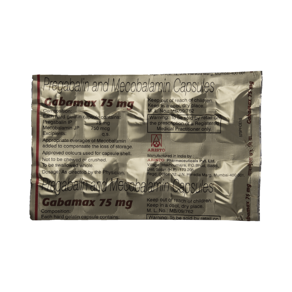 Gabamax 75mg Capsule is a prescription medicine used for the treatment of neuropathic pain. It decreases pain by modulating the calcium channel activity of the nerve cells. This medicine also protects nerve fibers and heals damaged nerve cells. Gabamax 75mg Capsule may be taken with or without food, preferably at bedtime. It is advised to take it at the same time each day as this helps to maintain a consistent level of medicine in the body. Take this medicine in the dose and duration advised by your doctor. If you miss a dose of this medicine, take it as soon as you remember. Finish the full course of treatment even if you feel better. This medication must not be stopped suddenly without talking to the doctor.Some common side effects of this medicine include nausea, vomiting, diarrhea, constipation, blurred vision, dizziness, and sleepiness. Do not drive or do anything that requires mental focus until you know how this medicine affects you. The side effects are mild and usually improve with time. It may also cause weight gain in some people. Exercise regularly and have a balanced diet to keep your weight in check. Inform your doctor if you develop any unusual changes in mood or behavior, new or worsening depression, or suicidal thoughts.Your doctor should also know about all other medicines you are taking, as many of these may make this medicine less effective or change the way it works. Inform your doctor if you are pregnant, planning pregnancy, or breastfeeding to make sure it is safe for you and the developing baby.