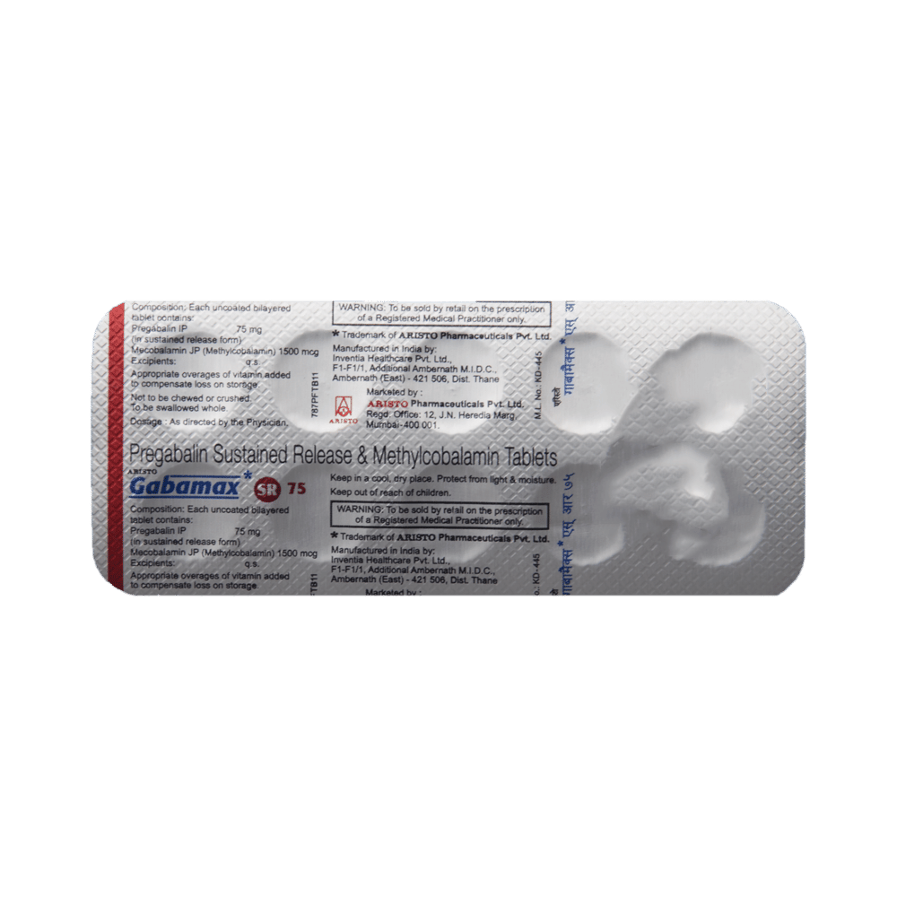 In Treatment of Neuropathic painGabamax SR 75 Tablet is a combination of medicines used to treat long-lasting (chronic) pain caused by nerve damage due to diabetes, shingles or spinal cord injury. It reduces pain and its associated symptoms such as mood changes, sleep problems, and tiredness. Pregabalin, an active ingredient of this medicine, is thought to work by interfering with pain signals that travel through the damaged nerves and the brain. It also contains nutritional supplements that improve nerve conduction. Taking Gabamax SR 75 Tablet regularly will improve your physical and social functioning and overall quality of life.
