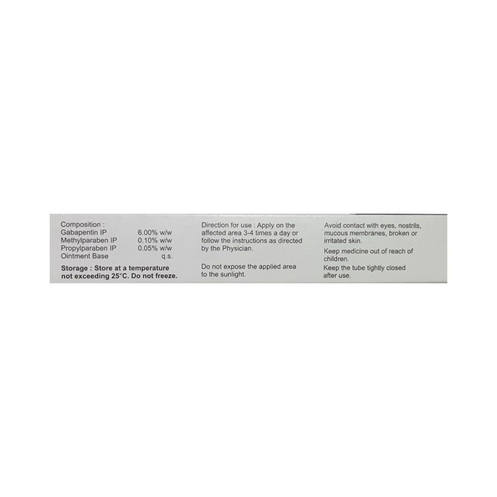 Gabament Ointment is a medicine used to relieve the pain caused by nerve damage (neuropathic pain) due to various conditions like diabetes, shingles (herpes zoster infection), spinal cord injury, etc. It works by blocking the pain signals from the damaged nerves. Gabament Ointment is meant for external use only. You should use this as per the dose and schedule as advised by your doctor. It should not be applied to broken or damaged skin. Avoid any contact with your eyes, nose, or mouth. Rinse it off with water if you accidentally get it in these areas. Do not stop using this medicine as soon as your pain gets better. Ask your doctor when you should stop treatment. Do not use larger amounts or apply it more often or for a longer duration than directed. This will only increase the risk of side effects.Side effects like application site redness, burning sensation, or itching may be seen in some people. These are usually temporary and resolve on their own. Consult your doctor if they bother you or do not go away.Before using this medicine, inform your doctor if you have any previous history of allergy to it or any other medicine. Pregnant or breastfeeding women should consult their doctor before using it. Consult your doctor if your pain does not improve despite using this medicine.