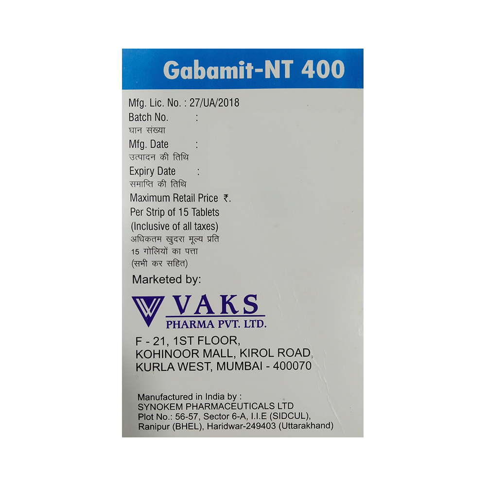 Gabamit-NT 400 Tablet is a combination medicine used for the treatment of neuropathic pain. This medicine decreases the pain by stopping the movement of pain signals to the brain. Gabamit-NT 400 Tablet is taken by mouth, with or without food and preferably at night. It is advised to take it at a fixed time each day to maintain a consistent level of medicine in the blood. In case you miss a dose of this medicine, take it as soon as you remember. Finish the full course of treatment even if you feel better. It is important not to stop taking this medicine suddenly without talking to the doctor as it may worsen your symptoms.Some common side effects of this medicine constipation, difficulty in urination, weight gain, tiredness, and dryness in mouth. It may also cause dizziness and sleepiness, so do not drive or do anything that requires mental focus until you know how this medicine affects you. This medicine may cause weight gain and to control it, you should exercise regularly and take a balanced diet. Remember to inform the doctor if you develop any unusual changes in mood as this medicine may lead to suicidal thoughts.Before taking this medicine let your doctor know if you suffer from kidney or liver disease. Your doctor should also know about all other medicines you are taking as many of these may make this medicine less effective or change the way it works. Inform your doctor if you are pregnant, planning pregnancy or breastfeeding.