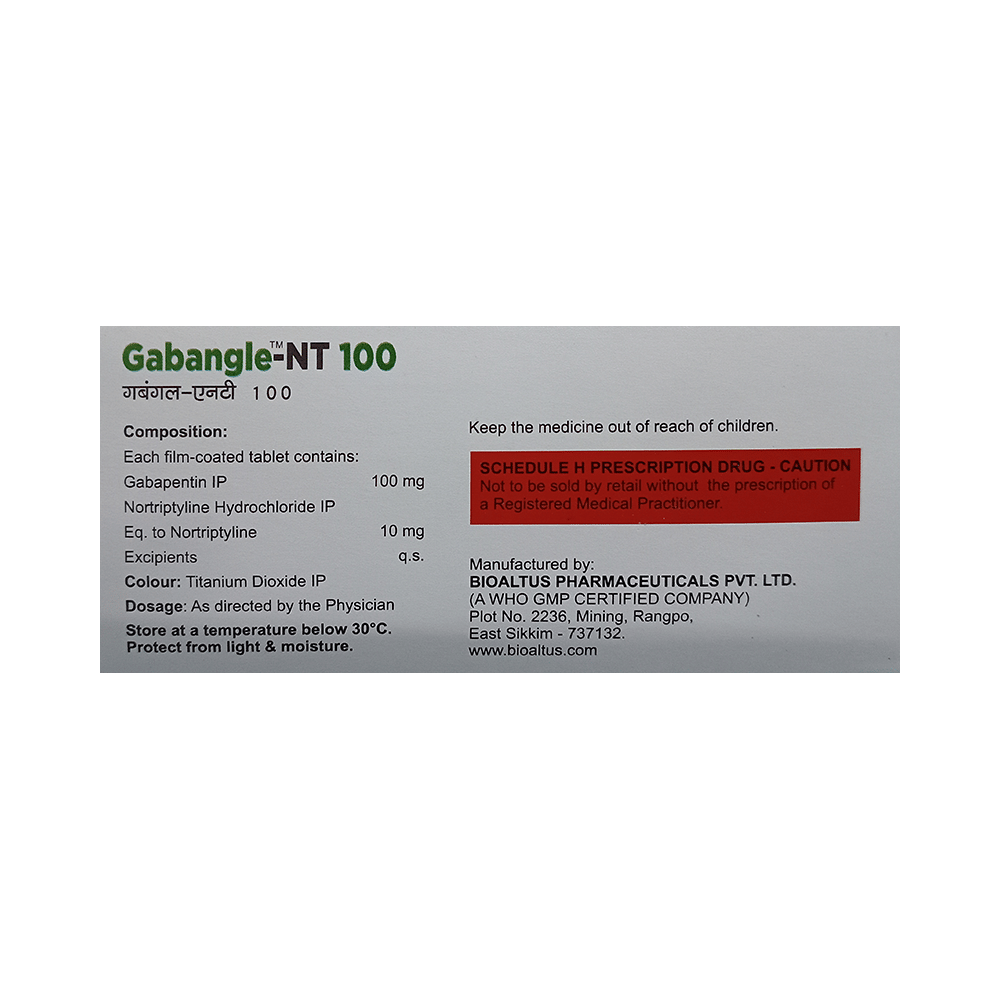 Gabangle-NT 100 Tablet is a combination medicine used for the treatment of neuropathic pain. This medicine decreases the pain by stopping the movement of pain signals to the brain. Gabangle-NT 100 Tablet is taken by mouth, with or without food and preferably at night. It is advised to take it at a fixed time each day to maintain a consistent level of medicine in the blood. In case you miss a dose of this medicine, take it as soon as you remember. Finish the full course of treatment even if you feel better. It is important not to stop taking this medicine suddenly without talking to the doctor as it may worsen your symptoms.Some common side effects of this medicine constipation, difficulty in urination, weight gain, tiredness, and dryness in mouth. It may also cause dizziness and sleepiness, so do not drive or do anything that requires mental focus until you know how this medicine affects you. This medicine may cause weight gain and to control it, you should exercise regularly and take a balanced diet. Remember to inform the doctor if you develop any unusual changes in mood as this medicine may lead to suicidal thoughts.Before taking this medicine let your doctor know if you suffer from kidney or liver disease. Your doctor should also know about all other medicines you are taking as many of these may make this medicine less effective or change the way it works. Inform your doctor if you are pregnant, planning pregnancy or breastfeeding.