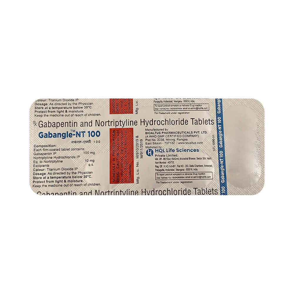 Gabangle-NT 100 Tablet is a combination of two medicines: Gabapentin and Nortriptyline. Gabapentin is an alpha 2 delta ligand which decreases the pain by modulating calcium channel activity of the nerve cells. Nortriptyline is a tricyclic antidepressant which increases the levels of chemical messengers (serotonin and noradrenaline) that stop the movement of pain signals in the brain. Together, they relieve neuropathic pain (pain from damaged nerves).