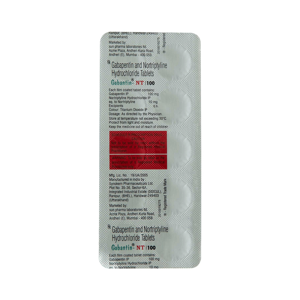 Gabantin NT 100mg/10mg Tablet is a combination medicine used for the treatment of neuropathic pain. This medicine decreases the pain by stopping the movement of pain signals to the brain. Gabantin NT 100mg/10mg Tablet is taken by mouth, with or without food and preferably at night. It is advised to take it at a fixed time each day to maintain a consistent level of medicine in the blood. In case you miss a dose of this medicine, take it as soon as you remember. Finish the full course of treatment even if you feel better. It is important not to stop taking this medicine suddenly without talking to the doctor as it may worsen your symptoms.Some common side effects of this medicine constipation, difficulty in urination, weight gain, tiredness, and dryness in mouth. It may also cause dizziness and sleepiness, so do not drive or do anything that requires mental focus until you know how this medicine affects you. This medicine may cause weight gain and to control it, you should exercise regularly and take a balanced diet. Remember to inform the doctor if you develop any unusual changes in mood as this medicine may lead to suicidal thoughts.Before taking this medicine let your doctor know if you suffer from kidney or liver disease. Your doctor should also know about all other medicines you are taking as many of these may make this medicine less effective or change the way it works. Inform your doctor if you are pregnant, planning pregnancy or breastfeeding.