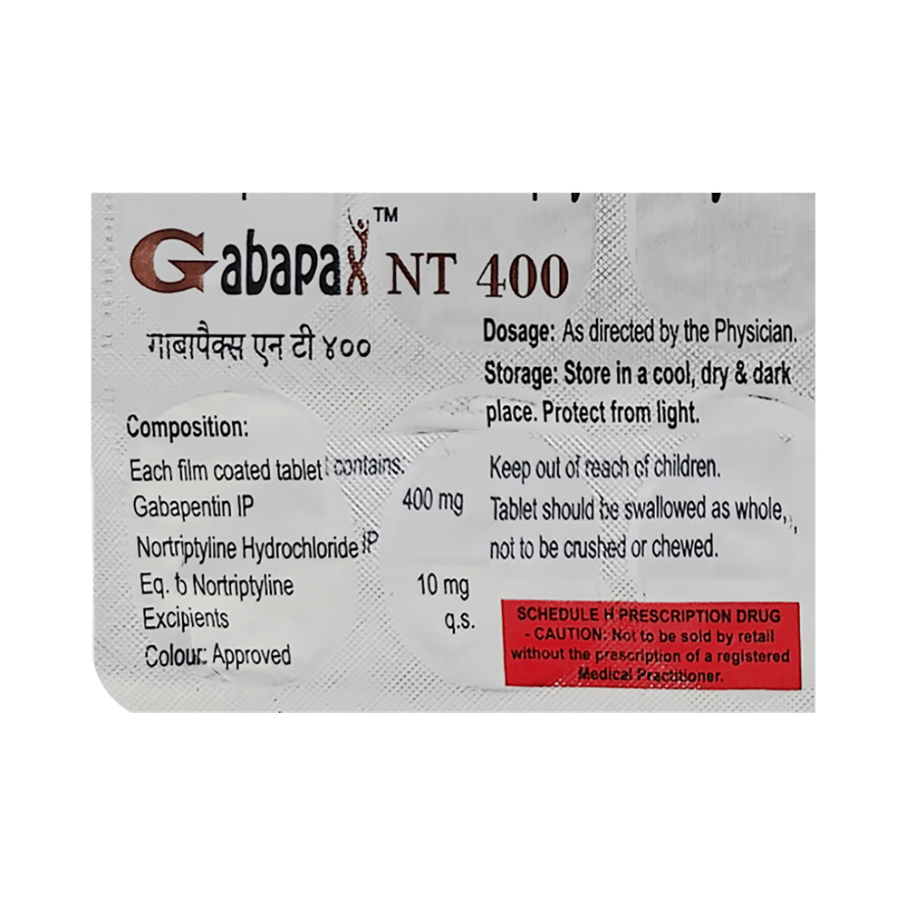 GabaPAX NT 400mg/10mg Tablet is a combination medicine used for the treatment of neuropathic pain. This medicine decreases the pain by stopping the movement of pain signals to the brain. GabaPAX NT 400mg/10mg Tablet is taken by mouth, with or without food and preferably at night. It is advised to take it at a fixed time each day to maintain a consistent level of medicine in the blood. In case you miss a dose of this medicine, take it as soon as you remember. Finish the full course of treatment even if you feel better. It is important not to stop taking this medicine suddenly without talking to the doctor as it may worsen your symptoms.Some common side effects of this medicine constipation, difficulty in urination, weight gain, tiredness, and dryness in mouth. It may also cause dizziness and sleepiness, so do not drive or do anything that requires mental focus until you know how this medicine affects you. This medicine may cause weight gain and to control it, you should exercise regularly and take a balanced diet. Remember to inform the doctor if you develop any unusual changes in mood as this medicine may lead to suicidal thoughts.Before taking this medicine let your doctor know if you suffer from kidney or liver disease. Your doctor should also know about all other medicines you are taking as many of these may make this medicine less effective or change the way it works. Inform your doctor if you are pregnant, planning pregnancy or breastfeeding.