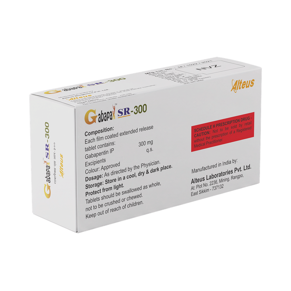Gabapax SR-300 Tablet is a medicine used to relieve the pain caused by nerve damage (neuropathic pain) due to various conditions like diabetes, shingles (herpes zoster infection), spinal cord injury, etc. It is also used to treat certain types of seizures (fits) in combination with other medicines. Gabapax SR-300 Tablet belongs to the anti-epileptic group of medicines. You may take it with or without food, but it is important to take this medicine at the same time each day to get the most benefit. The exact dose and duration of treatment will depend on your condition and how you respond to it. Your doctor will probably start this medicine at a low dose and increase it gradually. It may take a few weeks for the medicine to work properly. Follow your doctor’s instructions and continue taking it regularly until your doctor advises you to stop. Do not miss any dose, otherwise, your condition may worsen.Most people taking Gabapax SR-300 Tablet do not experience any side effects. The most common ones are feeling sleepy, dizzy, or tired (fatigue). These are usually mild and go away by themselves as your body gets used to the medicine. Most side effects are not serious and do not need medical attention. Talk to your doctor if any of the side effects persist or worry you.You should avoid drinking alcohol along with this medicine as it may lead to excessive sleepiness and dizziness. Let your doctor know right away if you develop any unusual mood changes like anxiety, agitation, depression, or thoughts about harming yourself.Before taking Gabapax SR-300 Tablet, you should tell your doctor if you have any kidney-related problems or if you are more than 65 years old. Your doctor may prescribe a different dose in such people. Women who are pregnant, breastfeeding, or planning to become pregnant should also consult their doctor before using this medicine.