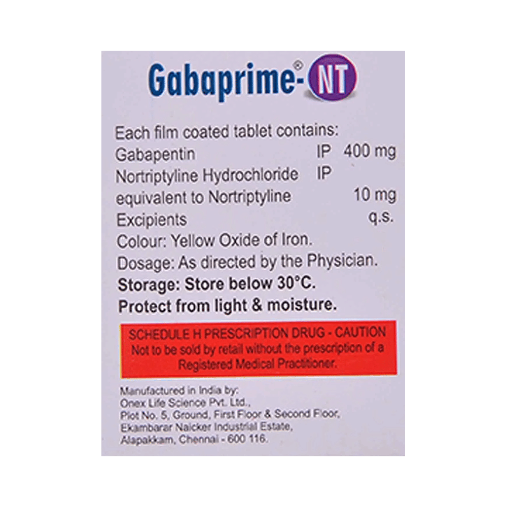 Gabaprime NT Tablet is a combination of two medicines: Gabapentin and Nortriptyline. Gabapentin is an alpha 2 delta ligand which decreases the pain by modulating calcium channel activity of the nerve cells. Nortriptyline is a tricyclic antidepressant which increases the levels of chemical messengers (serotonin and noradrenaline) that stop the movement of pain signals in the brain. Together, they relieve neuropathic pain (pain from damaged nerves).