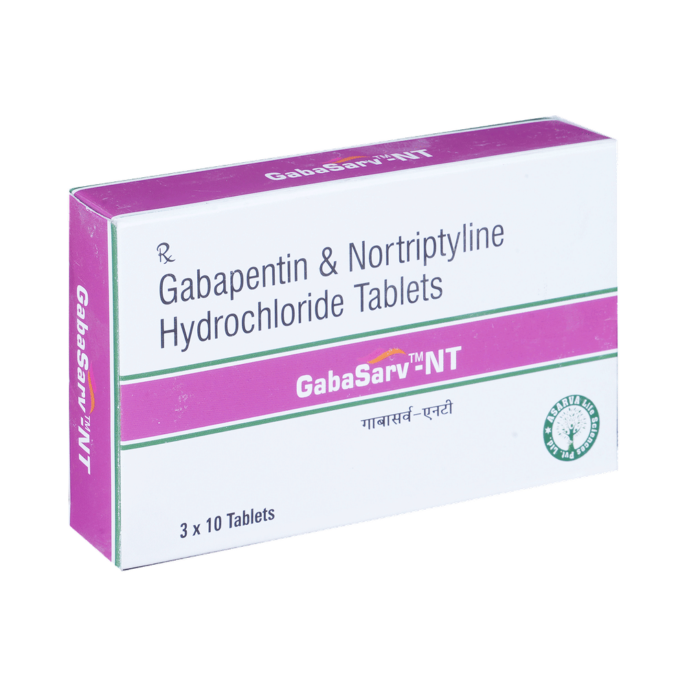 Gabasarv-NT Tablet is a combination medicine used for the treatment of neuropathic pain. This medicine decreases the pain by stopping the movement of pain signals to the brain. Gabasarv-NT Tablet is taken by mouth, with or without food and preferably at night. It is advised to take it at a fixed time each day to maintain a consistent level of medicine in the blood. In case you miss a dose of this medicine, take it as soon as you remember. Finish the full course of treatment even if you feel better. It is important not to stop taking this medicine suddenly without talking to the doctor as it may worsen your symptoms.Some common side effects of this medicine constipation, difficulty in urination, weight gain, tiredness, and dryness in mouth. It may also cause dizziness and sleepiness, so do not drive or do anything that requires mental focus until you know how this medicine affects you. This medicine may cause weight gain and to control it, you should exercise regularly and take a balanced diet. Remember to inform the doctor if you develop any unusual changes in mood as this medicine may lead to suicidal thoughts.Before taking this medicine let your doctor know if you suffer from kidney or liver disease. Your doctor should also know about all other medicines you are taking as many of these may make this medicine less effective or change the way it works. Inform your doctor if you are pregnant, planning pregnancy or breastfeeding.