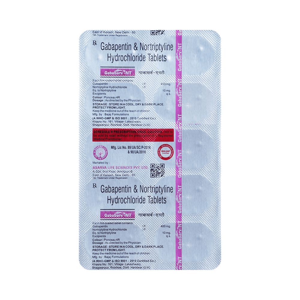 Gabasarv-NT Tablet is a combination of two medicines: Gabapentin and Nortriptyline. Gabapentin is an alpha 2 delta ligand which decreases the pain by modulating calcium channel activity of the nerve cells. Nortriptyline is a tricyclic antidepressant which increases the levels of chemical messengers (serotonin and noradrenaline) that stop the movement of pain signals in the brain. Together, they relieve neuropathic pain (pain from damaged nerves).