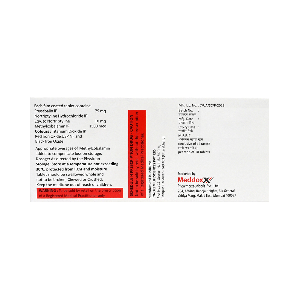 Salt Composition: Pregabalin (75mg) + Nortriptyline (10mg) + Methylcobalamin (1500mcg)