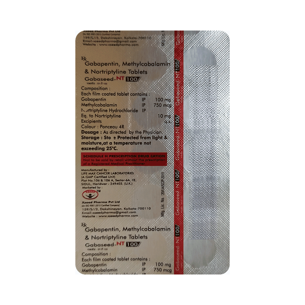 Gabaseed-NT 100 Tablet is a combination of three medicines: Gabapentin, Methylcobalamin and Nortriptyline. Gabapentin is an alpha 2 delta ligand which decreases pain by modulating calcium channel activity of the nerve cells. Methylcobalamin is a form of vitamin B which helps in the production of myelin, a substance that protects nerve fibers and rejuvenates damaged nerve cells. Nortriptyline is a tricyclic antidepressant which increases the levels of chemical messengers (serotonin and noradrenaline) that stop the movement of pain signals in the brain. Together, they relieve neuropathic pain (pain from damaged nerves).