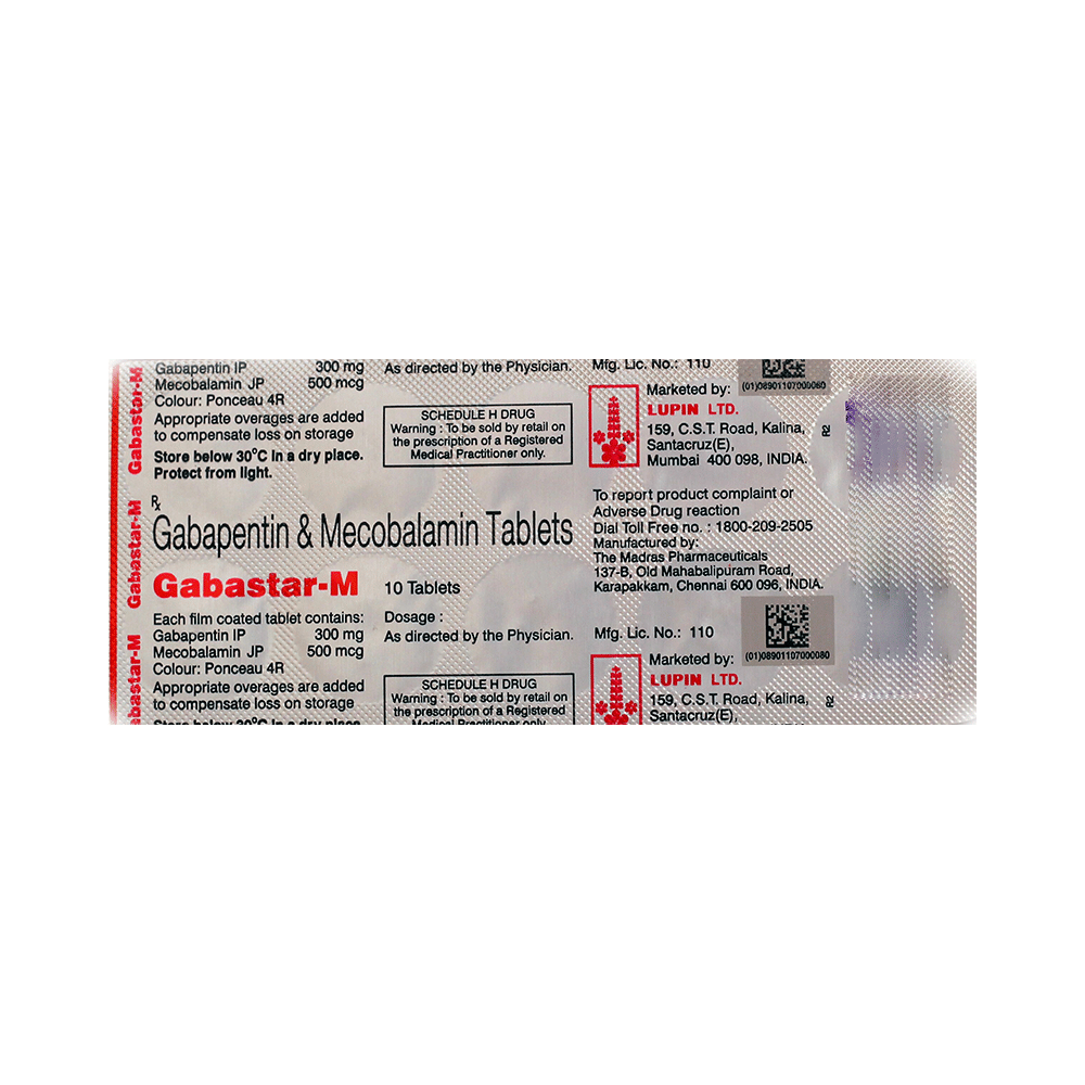 Gabastar-M 300mg/500mcg Tablet is a combination medicine used for the treatment of neuropathic pain. This medicine decreases pain by modulating calcium channel activity of the nerve cells. Gabastar-M 300mg/500mcg Tablet is taken by mouth with or without food, preferably at bedtime. It is advised to take medicine at the same time each day as this helps to maintain a consistent level of medicine in the body. Take this medicine in the dose and duration advised by your doctor. If you miss a dose of this medicine, take it as soon as you remember. Finish the full course of treatment even if you feel better. It is important that this medication is not stopped suddenly without talking to the doctor.Some common side effects of this medicine are nausea, peripheral edema, ataxia, blurred vision, fever and nystagmus (involuntary eye movement). It may also cause dizziness and sleepiness, so do not drive or do anything that requires mental focus until you know how this medicine affects you. It is important to inform your doctor if you develop any unusual changes in mood or behavior, new or worsening depression, or suicidal thoughts.Before taking the medicine you should tell your doctor if you are pregnant, planning to become pregnant, or breastfeeding. It can usually be mixed safely with other medicines but some drugs (including antacids and alcohol) do affect the way it works and can increase the chance of side effects.