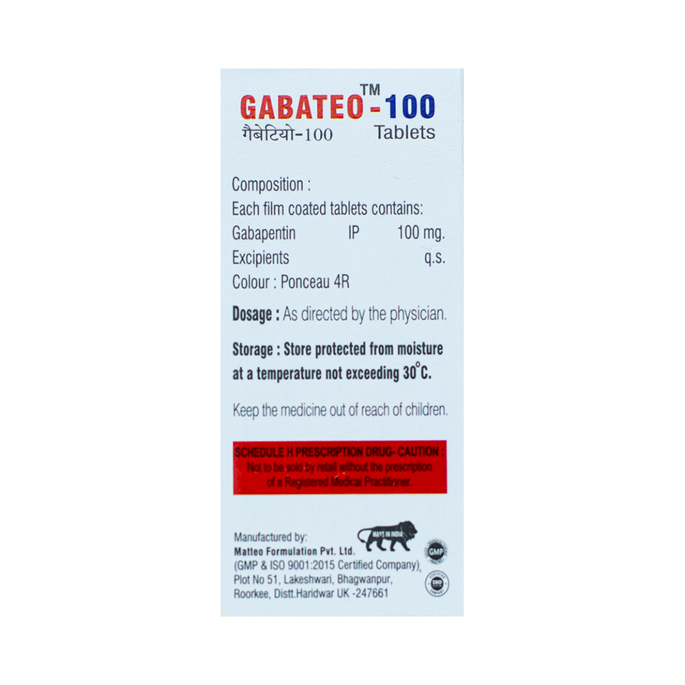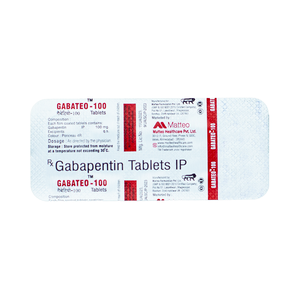 Gabateo 100 Tablet is a medicine used to relieve the pain caused by nerve damage (neuropathic pain) due to various conditions like diabetes, shingles (herpes zoster infection), spinal cord injury, etc. It is also used to treat certain types of seizures (fits) in combination with other medicines. Gabateo 100 Tablet belongs to the anti-epileptic group of medicines. You may take it with or without food, but it is important to take this medicine at the same time each day to get the most benefit. The exact dose and duration of treatment will depend on your condition and how you respond to it. Your doctor will probably start this medicine at a low dose and increase it gradually. It may take a few weeks for the medicine to work properly. Follow your doctor’s instructions and continue taking it regularly until your doctor advises you to stop. Do not miss any dose, otherwise, your condition may worsen.Most people taking Gabateo 100 Tablet do not experience any side effects. The most common ones are feeling sleepy, dizzy, or tired (fatigue). These are usually mild and go away by themselves as your body gets used to the medicine. Most side effects are not serious and do not need medical attention. Talk to your doctor if any of the side effects persist or worry you.You should avoid drinking alcohol along with this medicine as it may lead to excessive sleepiness and dizziness. Let your doctor know right away if you develop any unusual mood changes like anxiety, agitation, depression, or thoughts about harming yourself.Before taking Gabateo 100 Tablet, you should tell your doctor if you have any kidney-related problems or if you are more than 65 years old. Your doctor may prescribe a different dose in such people. Women who are pregnant, breastfeeding, or planning to become pregnant should also consult their doctor before using this medicine.