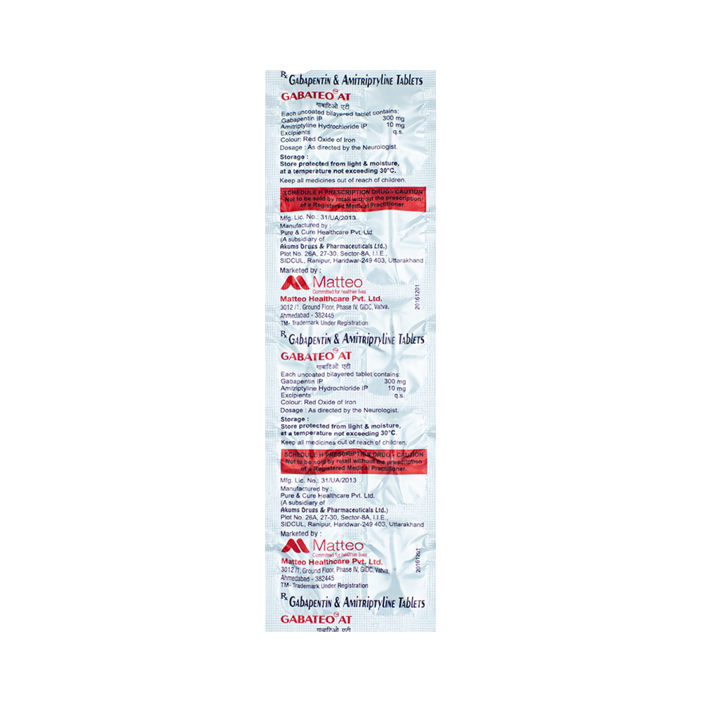 Gabateo AT Tablet is a combination medicine used for the treatment of neuropathic pain. It works by increasing the level of chemical messengers in the brain. This helps in regulating the mood and stopping the movement of pain signals from nerves to the brain. Gabateo AT Tablet is taken by mouth with or without food, preferably at bedtime. It is advised to take it at the same time each day as this helps to maintain a consistent level of medicine in the body. Take this medicine in the dose and duration advised by your doctor. If you miss a dose of this medicine, take it as soon as you remember. Finish the full course of the treatment even if you feel better. It is important that this medication is not stopped suddenly without talking to the doctor as it may increase the seizure frequency and can be life-threatening in some cases. Avoid taking antacids with this medicine as antacids make it harder for your body to absorb this medicine.Some common side effects of this medicine are constipation, difficulty in urination, weight gain, and dryness in mouth. It may also cause dizziness and sleepiness, so do not drive or do anything that requires mental focus until you know how this medicine affects you. This medicine may cause weight gain and to control it, you should exercise regularly and take a balanced diet.Before taking this medicine let your doctor know if you suffer from kidney or liver disease. Your doctor should also know about all other medicines you are taking as many of these may make this medicine less effective or change the way it works. Inform your doctor if you are pregnant, planning pregnancy or breastfeeding.