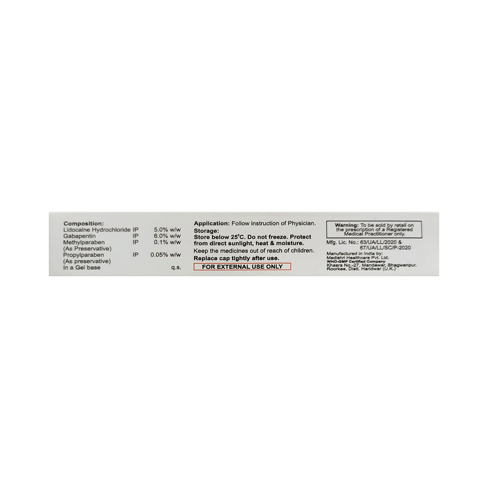 Gabatoss Gel is a combination of two medicines: Gabapentin and Lidocaine. Gabapentin is an alpha 2 delta ligand which decreases pain by modulating calcium channel activity of the nerve cells. Lidocaine is a local anesthetic which works by blocking pain signals from the nerves to brain thereby decreasing the sensation of pain. Together, they relieve neuropathic pain (pain from damaged nerves).