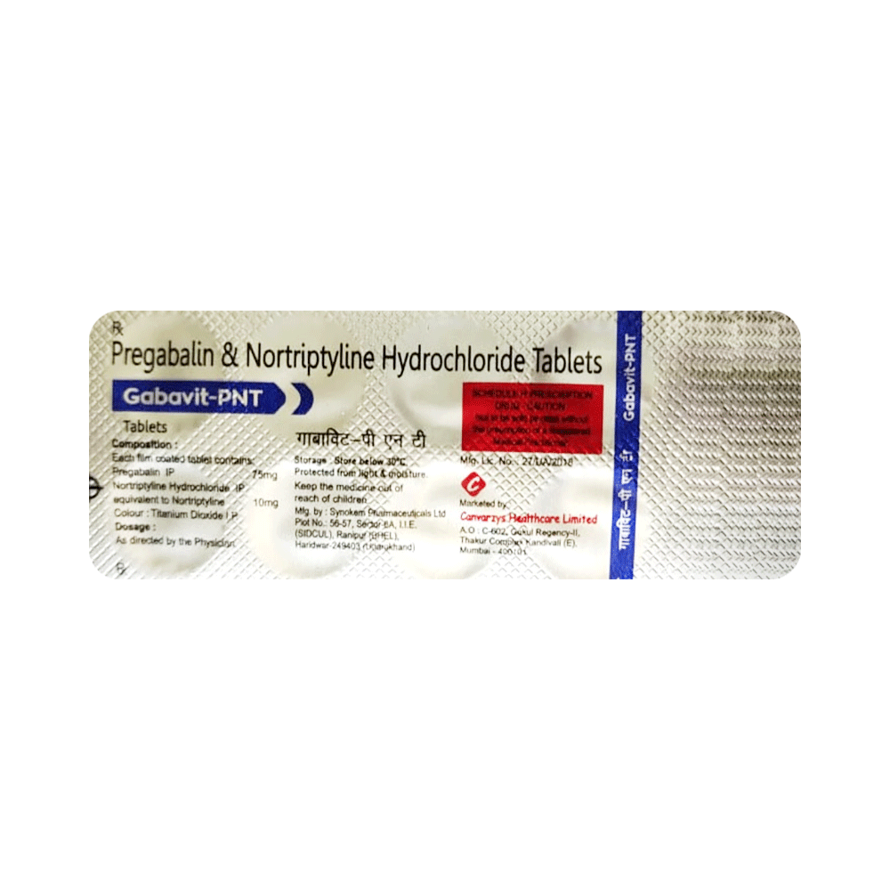 Gabavit-PNT Tablet is a combination of two medicines: Pregabalin and Nortriptyline. Pregabalin is an alpha-2 delta ligand that decreases pain by modulating the calcium channel activity of the nerve cells. Nortriptyline is a tricyclic antidepressant that increases the levels of chemical messengers (serotonin and noradrenaline) that stop the movement of pain signals in the brain. Together, they relieve neuropathic pain (pain from damaged nerves).