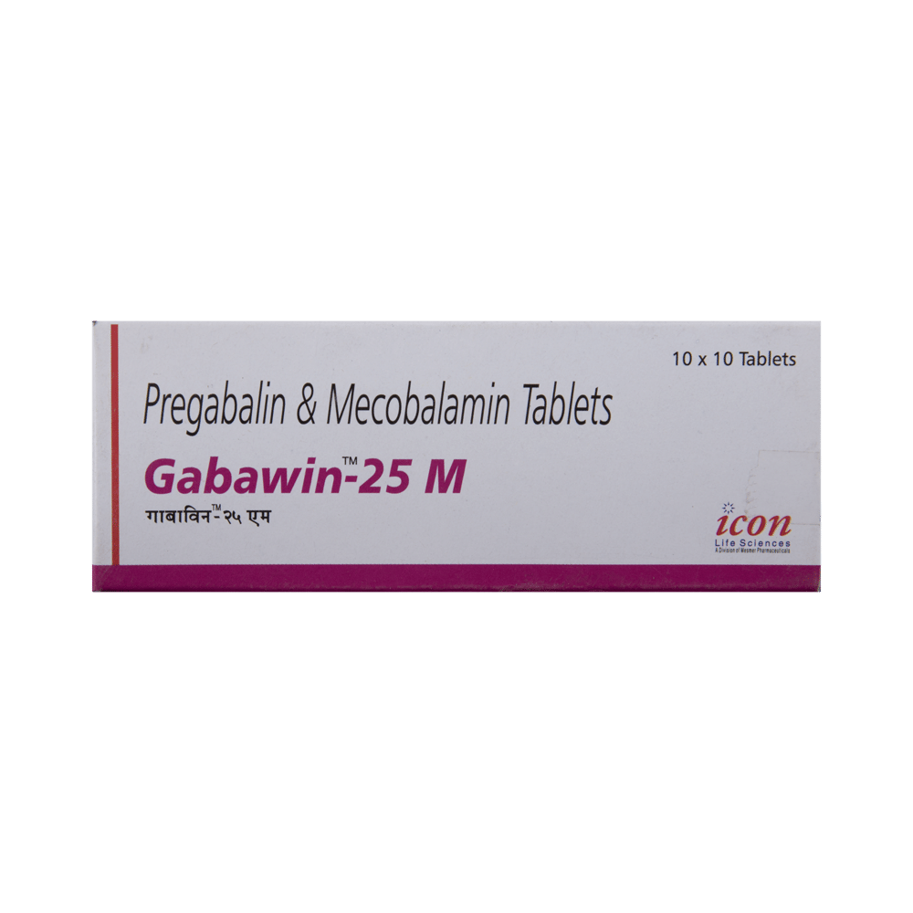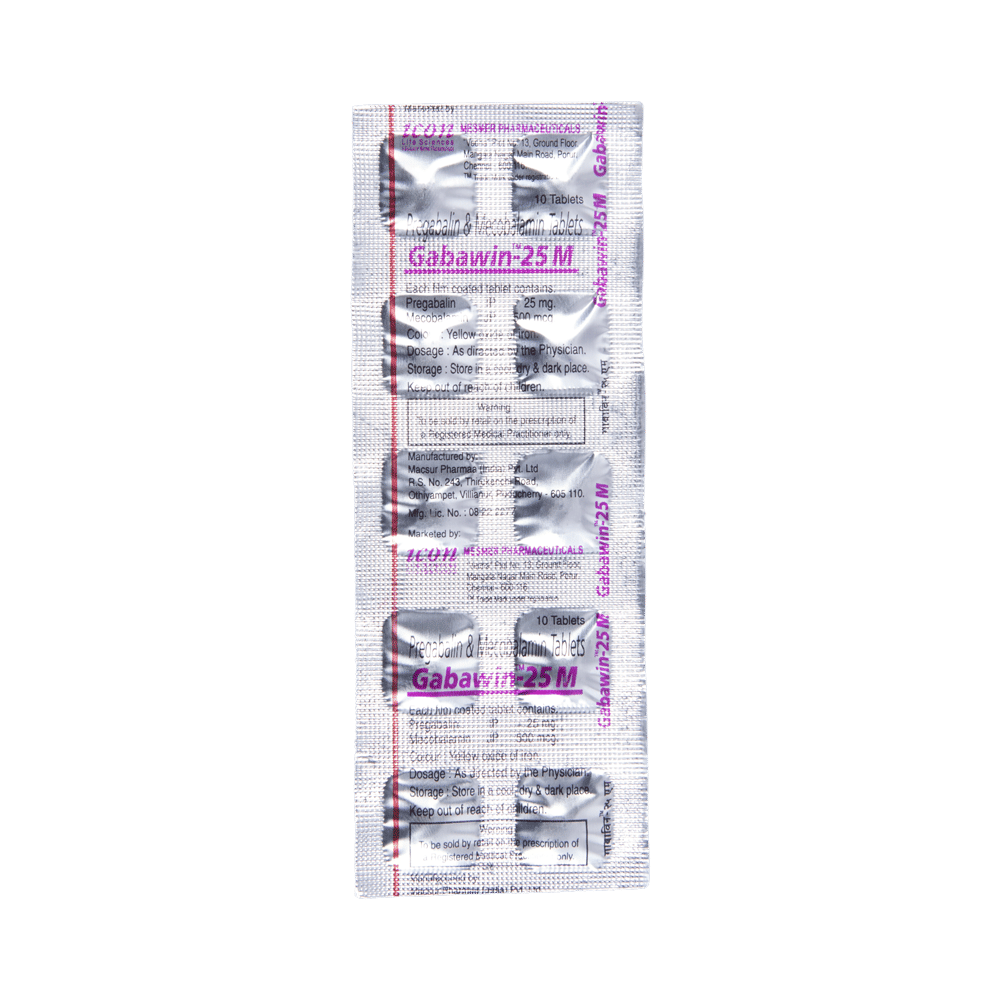 Gabawin 25 M Tablet is a prescription medicine used for the treatment of neuropathic pain. It decreases pain by modulating the calcium channel activity of the nerve cells. This medicine also protects nerve fibers and heals damaged nerve cells. Gabawin 25 M Tablet may be taken with or without food, preferably at bedtime. It is advised to take it at the same time each day as this helps to maintain a consistent level of medicine in the body. Take this medicine in the dose and duration advised by your doctor. If you miss a dose of this medicine, take it as soon as you remember. Finish the full course of treatment even if you feel better. This medication must not be stopped suddenly without talking to the doctor.Some common side effects of this medicine include nausea, vomiting, diarrhea, constipation, blurred vision, dizziness, and sleepiness. Do not drive or do anything that requires mental focus until you know how this medicine affects you. The side effects are mild and usually improve with time. It may also cause weight gain in some people. Exercise regularly and have a balanced diet to keep your weight in check. Inform your doctor if you develop any unusual changes in mood or behavior, new or worsening depression, or suicidal thoughts.Your doctor should also know about all other medicines you are taking, as many of these may make this medicine less effective or change the way it works. Inform your doctor if you are pregnant, planning pregnancy, or breastfeeding to make sure it is safe for you and the developing baby.