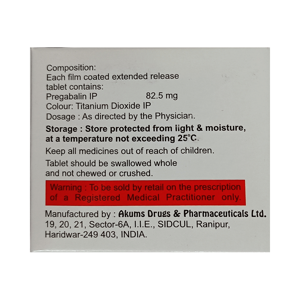 Gabawin-ER 82.5 Tablet is a medicine used to relieve pain caused by nerve damage (neuropathic pain) due to diabetes, shingles (herpes zoster infection), spinal cord injury, or other conditions. It is also used to treat widespread muscle pain and stiffness in people with fibromyalgia. Gabawin-ER 82.5 Tablet belongs to the anti-epileptic group of medicines and can also be used to treat certain types of seizures (fits) in combination with other medicines. Additionally, it may also be prescribed to treat the symptoms of anxiety disorder if other medicines are not suitable.You can take Gabawin-ER 82.5 Tablet with or without food, but it is important to take this medicine at the same time each day to get the most benefit. The exact dose and duration of treatment will depend on your condition and how you respond to it. Your doctor will probably start this medicine at a low dose and increase it gradually. It may take a few weeks for the medicine to work properly. Follow your doctor’s instructions and continue taking it regularly until your doctor advises you to stop. Do not miss any dose, otherwise, your condition may worsen.The side effects of this medicine are usually mild and go away by themselves. The most common ones are feeling sleepy or dizzy, dryness in the mouth, blurred vision, weight gain, edema (swelling over the whole body), and difficulty in concentrating. Most side effects are not serious and do not need medical attention. Talk to your doctor about potential side effects and ways in which you might prevent or cope with them.Before taking the medicine you should tell your doctor if you are pregnant, breastfeeding, or planning to become pregnant. Be careful while driving as sleepiness, dizziness, and blurring of vision may be seen as side effects. You should avoid drinking alcohol along with this medicine as it may lead to excessive sleepiness and dizziness.