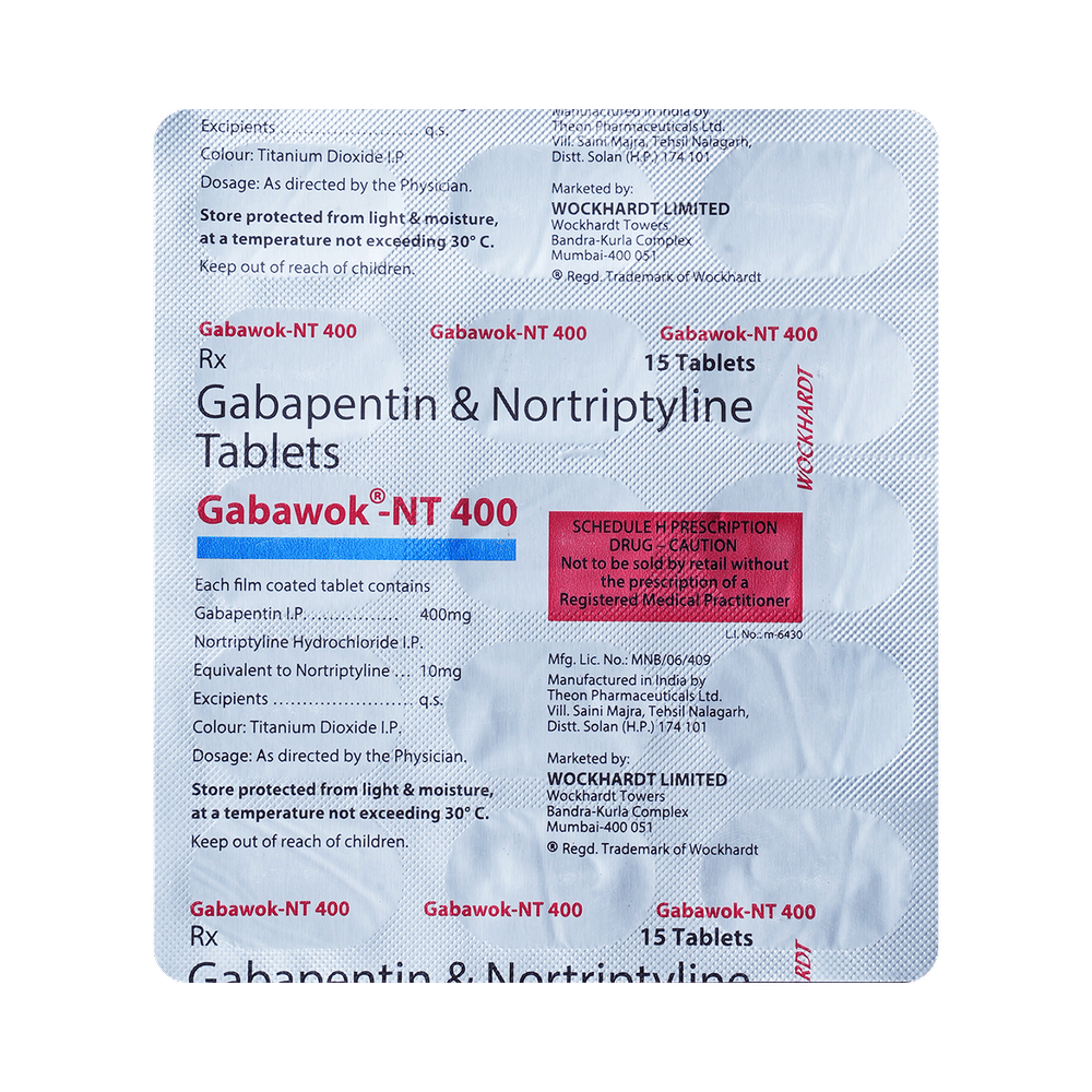 Gabawok-NT Tablet is a combination of two medicines: Gabapentin and Nortriptyline. Gabapentin is an alpha 2 delta ligand which decreases the pain by modulating calcium channel activity of the nerve cells. Nortriptyline is a tricyclic antidepressant which increases the levels of chemical messengers (serotonin and noradrenaline) that stop the movement of pain signals in the brain. Together, they relieve neuropathic pain (pain from damaged nerves).