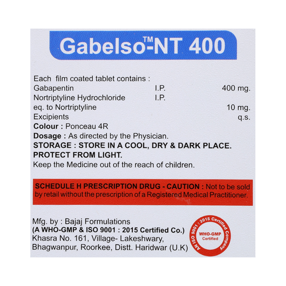 Gabelso-NT 400 Tablet is a combination of two medicines: Gabapentin and Nortriptyline. Gabapentin is an alpha 2 delta ligand which decreases the pain by modulating calcium channel activity of the nerve cells. Nortriptyline is a tricyclic antidepressant which increases the levels of chemical messengers (serotonin and noradrenaline) that stop the movement of pain signals in the brain. Together, they relieve neuropathic pain (pain from damaged nerves).