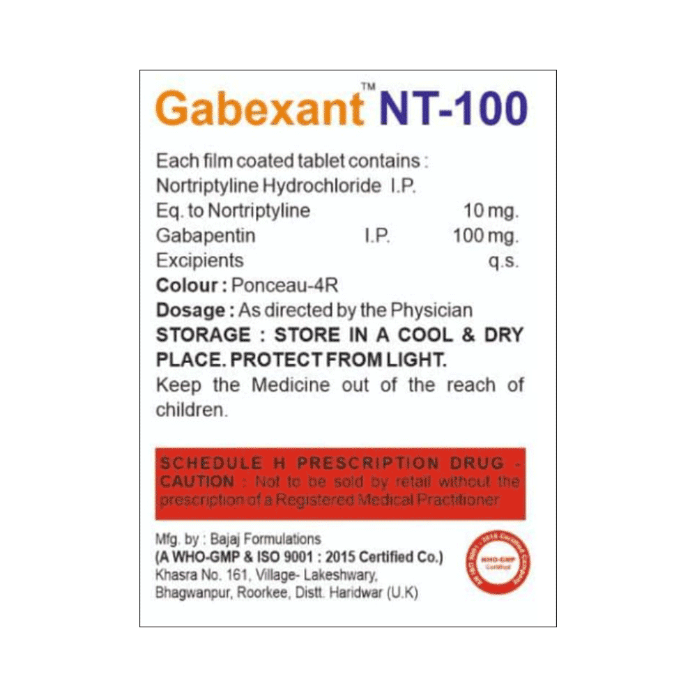 Gabexant NT 100 Tablet is a combination of two medicines: Gabapentin and Nortriptyline. Gabapentin is an alpha 2 delta ligand which decreases the pain by modulating calcium channel activity of the nerve cells. Nortriptyline is a tricyclic antidepressant which increases the levels of chemical messengers (serotonin and noradrenaline) that stop the movement of pain signals in the brain. Together, they relieve neuropathic pain (pain from damaged nerves).