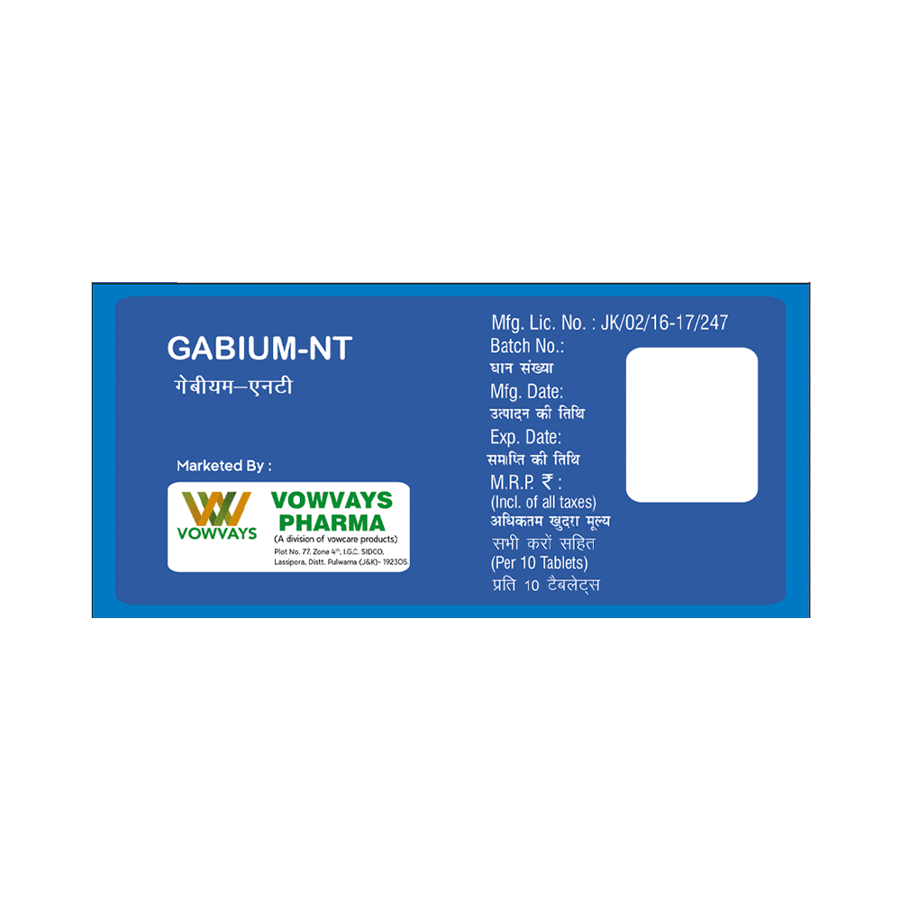 Gabium NT Tablet is a combination medicine used for the treatment of neuropathic pain. This medicine decreases the pain by stopping the movement of pain signals to the brain. Gabium NT Tablet may be taken with or without food, preferably at bedtime. Take it at the same time each day as this helps to maintain a consistent level of medicine in the blood. Take this medicine in the dose and duration advised by your doctor. If you miss a dose of this medicine, take it as soon as you remember. Finish the complete course of treatment even if you feel better. Do not stop this medication suddenly without talking to the doctor.Some common side effects of this medicine include constipation, nausea, vision disturbance, and excessive sweating. It may also cause dizziness and sleepiness. So, do not drive or do anything that requires mental focus until you know how this medicine affects you. This medicine may cause weight gain, and to control it, you should exercise regularly and have a balanced diet. It is important to inform your doctor if you develop any unusual changes in mood or behavior, new or worsening depression, or suicidal thoughts.Before taking Gabium NT Tablet, let your doctor know if you suffer from kidney or liver disease. Your doctor should also know about all other medicines you are taking, as many of these may make this medicine less effective or change the way it works. Inform your doctor if you are pregnant, planning pregnancy, or breastfeeding.