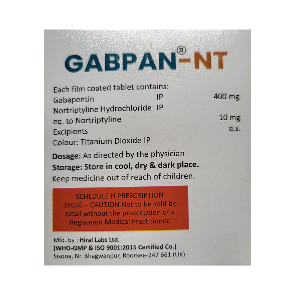 Gabpan-NT Tablet is a combination of two medicines: Gabapentin and Nortriptyline. Gabapentin is an alpha 2 delta ligand which decreases the pain by modulating calcium channel activity of the nerve cells. Nortriptyline is a tricyclic antidepressant which increases the levels of chemical messengers (serotonin and noradrenaline) that stop the movement of pain signals in the brain. Together, they relieve neuropathic pain (pain from damaged nerves).