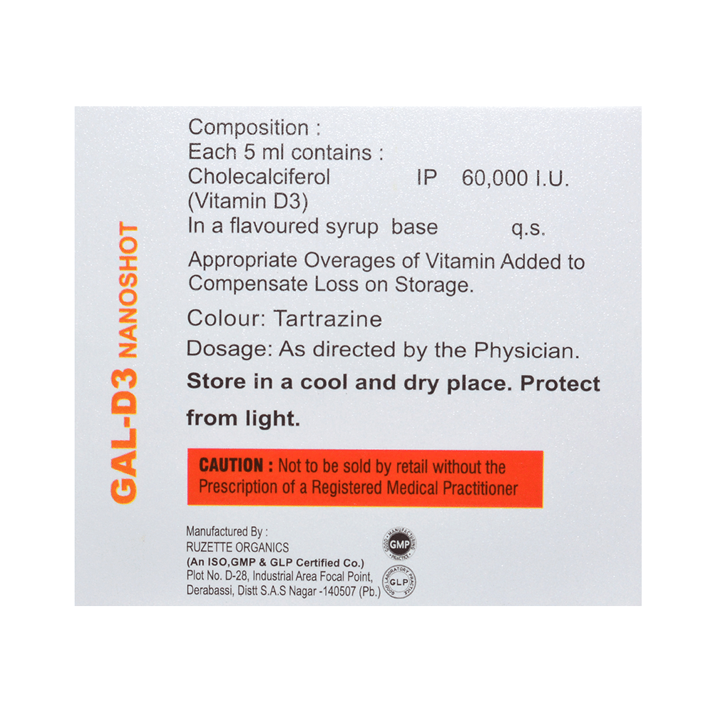 Gal-D3 Nanoshot Mango Sugar Free is used in the treatment of vitamin D deficiency and osteoporosis. It helps the body to absorb calcium. Calcium is essential for maintaining strong and healthy bones. It is used when your diet does not provide enough calcium. Gal-D3 Nanoshot Mango Sugar Free should be taken as directed by your doctor. It is best taken with or after food, as this helps your body absorb it, and you should take it regularly to get the most benefits. If you are using it to treat osteoporosis, you will also be prescribed other medicines. This medicine may be only part of a complete treatment program that includes making changes to your diet and taking calcium and vitamin supplements. Learn about the foods you should eat to ensure you get enough calcium and vitamin D.Gal-D3 Nanoshot Mango Sugar Free has few side effects, and none are common. If you take too much, you may feel weakness, muscle pain, or a metallic taste in your mouth. If you experience any such side effects, speak with your doctor. They may be able to help you reduce or treat the symptoms.Before taking this medicine, tell your doctor if you have high calcium levels in your blood or if you have any heart, kidney, or liver disease. Some other medicines can decrease the absorption of vitamin D3, so let your doctor know about all the other medicines you are taking to make sure you are safe. This medicine may help during pregnancy when your body needs more vitamin D, but too much could harm your baby. Discuss it with your doctor.