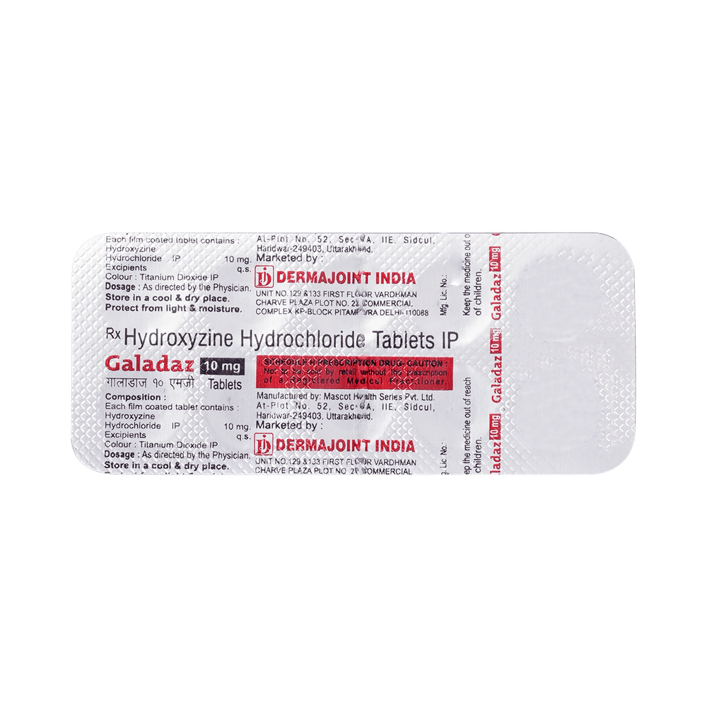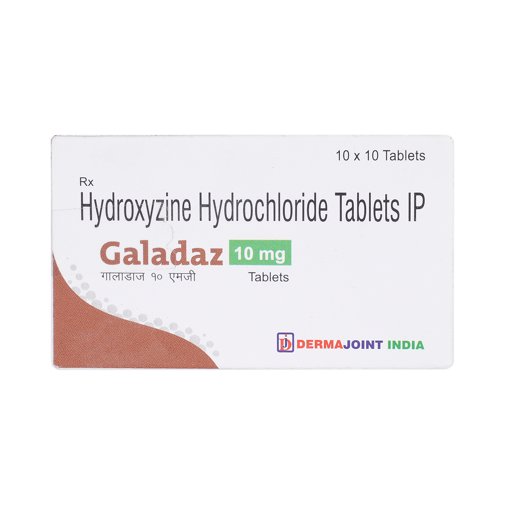Galadaz 10mg Tablet is used to treat symptoms of skin allergy like itching, swelling, and rashes in conditions such as eczema, dermatitis, and psoriasis. It is also used to treat anxiety and helps to relax before or after surgery. Galadaz 10mg Tablet should be taken with or without food. Take it exactly as your doctor has prescribed. The dose and how often you take it depend on what you are taking it for. Your doctor will decide how much you need to improve your symptoms. Take it for as long as it is prescribed for you. In case you have missed any doses, take the next dose as soon as you remember it. However, you should never take a double dose.The most common side effects of this medicine include drowsiness, dizziness, blurred vision, constipation, and dry mouth. If these bother you or appear serious, let your doctor know. There may be ways of reducing or preventing them.Before taking this medicine, let your doctor know if you have heart problems, high blood pressure, or liver or kidney problems. Inform your doctor if you are pregnant or breastfeeding. Your doctor should also know about all other medicines you are taking, as many of these may make this medicine less effective or change the way it works. Generally, it is advised to avoid alcohol while on treatment.