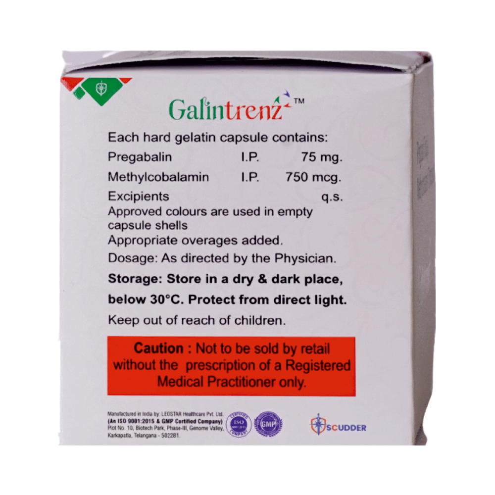 Galintrenz Capsule is a prescription medicine used for the treatment of neuropathic pain. It decreases pain by modulating the calcium channel activity of the nerve cells. This medicine also protects nerve fibers and heals damaged nerve cells. Galintrenz Capsule may be taken with or without food, preferably at bedtime. It is advised to take it at the same time each day as this helps to maintain a consistent level of medicine in the body. Take this medicine in the dose and duration advised by your doctor. If you miss a dose of this medicine, take it as soon as you remember. Finish the full course of treatment even if you feel better. This medication must not be stopped suddenly without talking to the doctor.Some common side effects of this medicine include nausea, vomiting, diarrhea, constipation, blurred vision, dizziness, and sleepiness. Do not drive or do anything that requires mental focus until you know how this medicine affects you. The side effects are mild and usually improve with time. It may also cause weight gain in some people. Exercise regularly and have a balanced diet to keep your weight in check. Inform your doctor if you develop any unusual changes in mood or behavior, new or worsening depression, or suicidal thoughts.Your doctor should also know about all other medicines you are taking, as many of these may make this medicine less effective or change the way it works. Inform your doctor if you are pregnant, planning pregnancy, or breastfeeding to make sure it is safe for you and the developing baby.