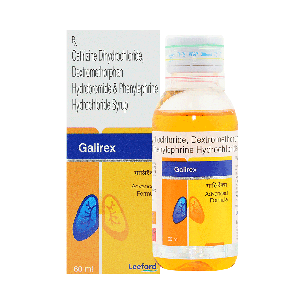 Galirex Syrup is a combination medicine used in the treatment of dry cough. It narrows the small blood vessels and provides relief from congestion or stuffiness in the nose. It also relieves allergy symptoms like watery eyes, sneezing, runny nose, and throat irritation. Galirex Syrup is taken with or without food in a dose and duration as advised by the doctor. The dose you are given will depend on your condition and how you respond to the medicine. You should keep taking this medicine for as long as your doctor recommends. If you stop treatment too early your symptoms may come back and your condition may worsen. Let your doctor know about all other medications you are taking as some may affect, or be affected by this medicine.The most common side effects are nausea, vomiting, upset stomach, dryness in mouth, headache, and fatigue. Most of these are temporary and usually resolve with time. Contact your doctor straight away if you are at all concerned about any of these side effects. This medicine can also cause dizziness and sleepiness, so do not drive or do anything that requires mental focus until you know how this medicine affects you. Avoid drinking alcohol while taking this medicine as it can make dizziness worse.Never support self-medication or recommend your medicine to another person. Keep it out of reach of children. It is beneficial to have plenty of fluids while taking this medication. Before taking it, you should tell your doctor if you have any kidney or liver diseases so that your doctor can prescribe a suitable dose for you. Pregnant or breastfeeding women should also consult their doctor before taking this medicine.