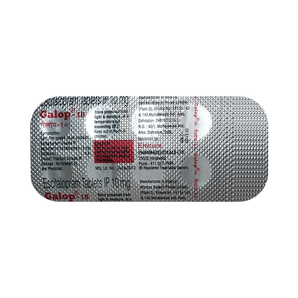 Galop 10 Tablet is widely prescribed to treat depression and other mental health conditions like anxiety, panic disorder, and obsessive-compulsive disorder. It is a type of antidepressant known as a selective serotonin reuptake inhibitor (SSRI). Galop 10 Tablet helps recover from depression by improving mood and relieving anxiety and tension. It can be taken with or without food. The dose and how often you need it will be decided by your doctor based on the amount needed to control your symptoms. Your doctor may start you on a lower dose and increase it gradually. Do not change the dose or stop taking it without talking to your doctor, even if you feel well. Doing so may make your condition worse or you may suffer from unpleasant withdrawal symptoms such as anxiety, restlessness, palpitations, dizziness, sleep disturbances.To get the most benefit, take this medicine regularly at the same time each day. Your doctor may advise you to take it in the morning if you have trouble sleeping. It may take a few weeks before you start feeling better. Let your doctor know if you do not see any improvement even after 4 weeks.Some common side effects of this medicine include nausea, fatigue, increased sweating, insomnia (difficulty in sleeping), decreased sexual drive, delayed ejaculation, and women may experience difficulties achieving orgasm. Some people may experience sleepiness after taking this medicine. Let your doctor know straight away if you develop any sudden worsening of mood or any thoughts about harming yourself.Before taking Galop 10 Tablet, you should tell your doctor if you have epilepsy (seizure disorder or fits), diabetes, liver or kidney disease, any heart problems, or are currently taking medicines for depression known as MAO inhibitors. These may affect your treatment. Please tell your doctor about all the medicines you are taking to make sure you are safe.