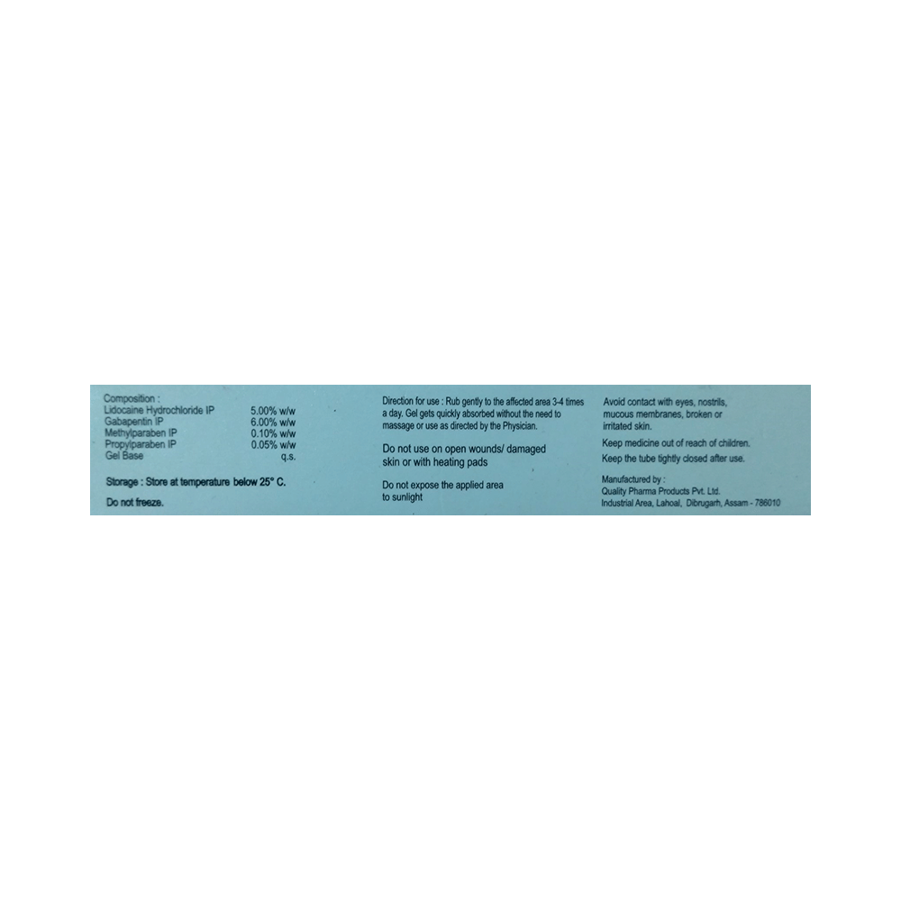 Gapitas-L Gel is used for the treatment of neuropathic pain. It works by cooling the skin then warming it up. This cooling and warming up action blocks the pain signal transmission through nerves to reach the brain and decreases the pain sensation. Gapitas-L Gel is for external use only. You should use it in the dose and duration as advised by your doctor. You must wash your hands thoroughly before and after applying this medicine. This medicine should be used regularly to get the most benefit from it. Do not stop using it until you have finished the complete course, even when you feel better.The most common side effects of this medicine include application site reactions like burning, irritation, itching, and redness. These are usually mild but let your doctor know if they bother you or last more than a few days. Avoid direct contact with eyes, nose, or mouth. If accidental exposure occurs, rinse immediately with plenty of water. Before using this medicine inform your doctor if you are pregnant.