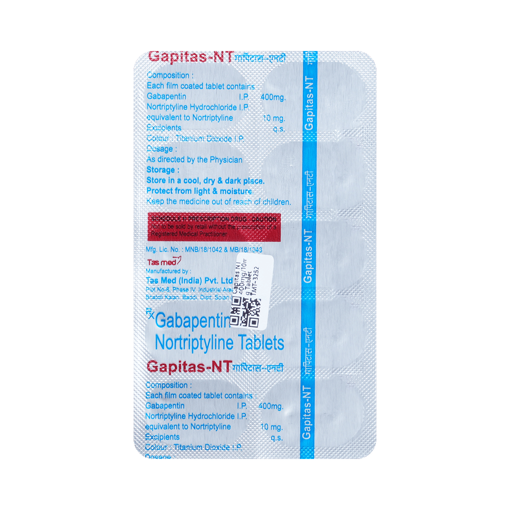 Gapitas NT 400mg/10mg Tablet is a combination of two medicines: Gabapentin and Nortriptyline. Gabapentin is an alpha 2 delta ligand which decreases the pain by modulating calcium channel activity of the nerve cells. Nortriptyline is a tricyclic antidepressant which increases the levels of chemical messengers (serotonin and noradrenaline) that stop the movement of pain signals in the brain. Together, they relieve neuropathic pain (pain from damaged nerves).