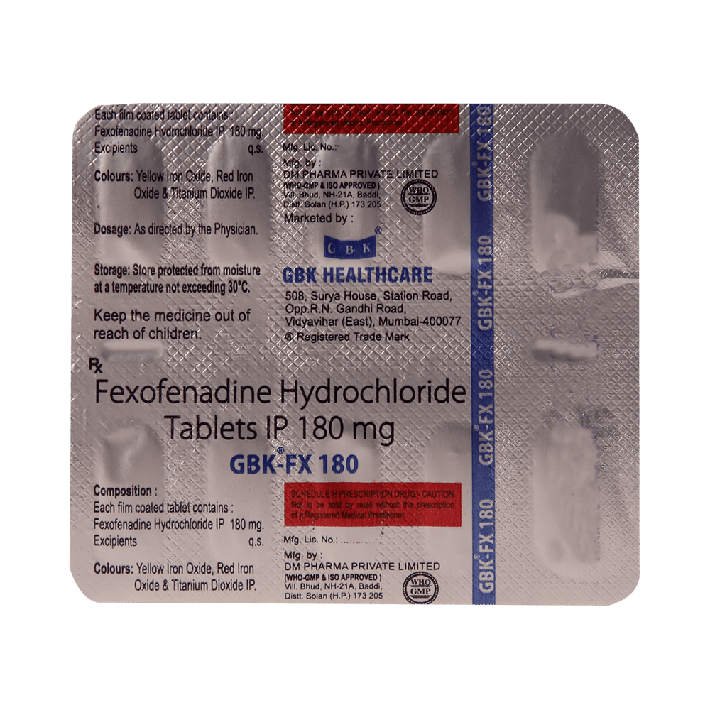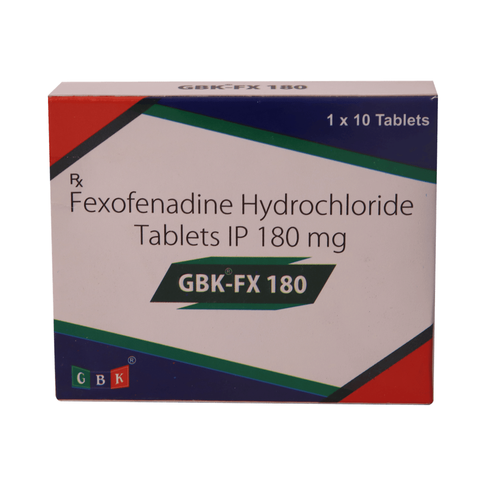 Gbk FX 180mg Tablet is an anti-allergy medicine used in the treatment of allergic symptoms such as runny nose, congestion or stuffiness, sneezing, itching, swelling, and watery eyes. It also helps treat skin allergies with itching, redness, or swelling. Gbk FX 180mg Tablet may be taken with or without food, in the dose and duration as advised by the doctor. The dose you are given will depend on your condition and how you respond to the medicine. You should keep taking this medicine for as long as your doctor recommends. Do not stop taking it without consulting your doctor.The most common side effects are headache, drowsiness, dizziness, and nausea. Most of these are temporary and usually resolve with time. Please consult your doctor if any of these side effects do not resolve or persist for a longer duration.Do not self-medicate or recommend your medicine to another person even if you see the similarity in symptoms. Consult your doctor to get the most benefit. Inform your doctor if you are suffering from any problems related to the kidneys, liver, or heart. Pregnant and breastfeeding mothers should not take this medicine without consulting a doctor.