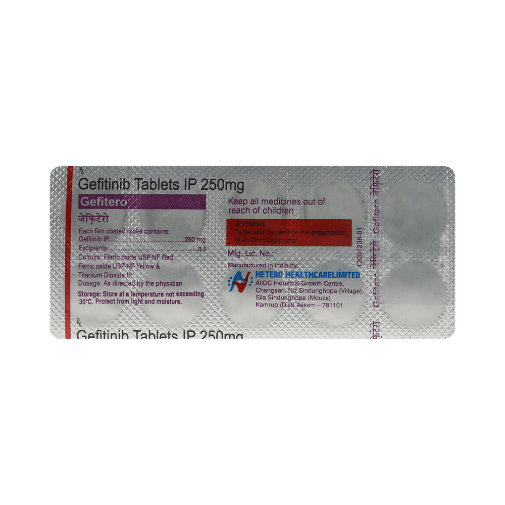 Gefitero Tablet is used in the treatment of non-small cell lung cancer. It is used in patients in which it has spread to other parts of the body, who have abnormal epidermal growth factor receptor (EGFR) genes, and who have not had previous treatment for cancer. Gefitero Tablet should be taken in a dose as recommended by the doctor. You should continue to take it as long as your doctor advises for it. The duration of treatment varies according to your need and response to treatment. Your doctor may advice for regular monitoring of liver function while your taking this medicine.Common side effects include diarrhea, dry skin, loss of appetite, and nausea. Drink plenty of fluids to reduce the risk of side effects. Inform your doctor if any of the side effects bother you or get worse. In case you develop ulceration in mouth, changes in your vision, or breathing difficulties than it is better to inform the doctor.Women who are undergoing treatment should use effective contraception method. It is important to avoid pregnancy during the treatment and for a month after completing the course of medicine. Let your doctor also know about all the other medications you are taking.