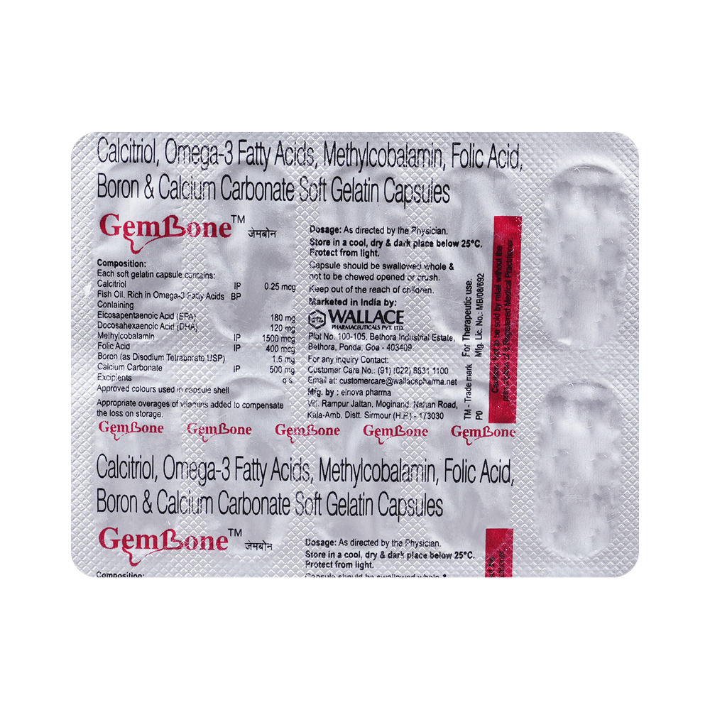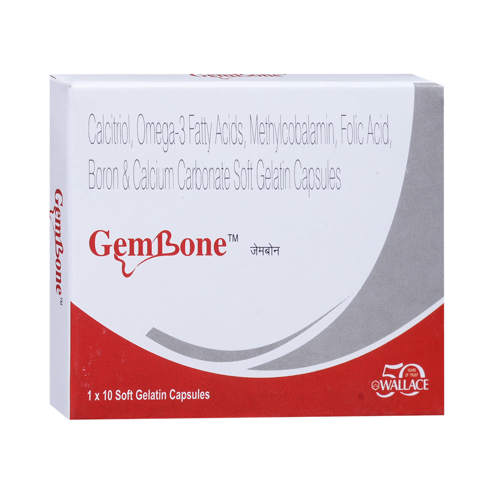 Gembone Soft Gelatin Capsule is a nutritional supplement used for the treatment and prevention of nutritional deficiencies. It provides broad support to both the musculoskeletal and nervous systems, helping improve overall health and vitality. Take Gembone Soft Gelatin Capsule in the exact dose and duration prescribed by your doctor. Take it regularly and avoid skipping doses. Gembone Soft Gelatin Capsule is not a substitute for a balanced diet. For maximum benefits, combine it with a healthy diet rich in calcium and vitamin D, regular physical activity, and adequate hydration.There is limited data on the common side effects of Gembone Soft Gelatin Capsule. Some people may experience mild side effects such as bloating, constipation, stomach discomfort, or a fishy aftertaste due to the omega-3 content. These symptoms are usually temporary and can often be managed by taking the capsule with food. If you experience any side effects that persist or worsen, consult your doctor for guidance.Before starting Gembone Soft Gelatin Capsule, inform your doctor if you have any medical conditions such as kidney problems, a history of kidney stones, or high calcium levels in the blood. Pregnant and breastfeeding women should use this medicine only under medical supervision. Your doctor may recommend regular follow-up and blood tests to monitor your response to treatment. Make sure to attend all the appointments.