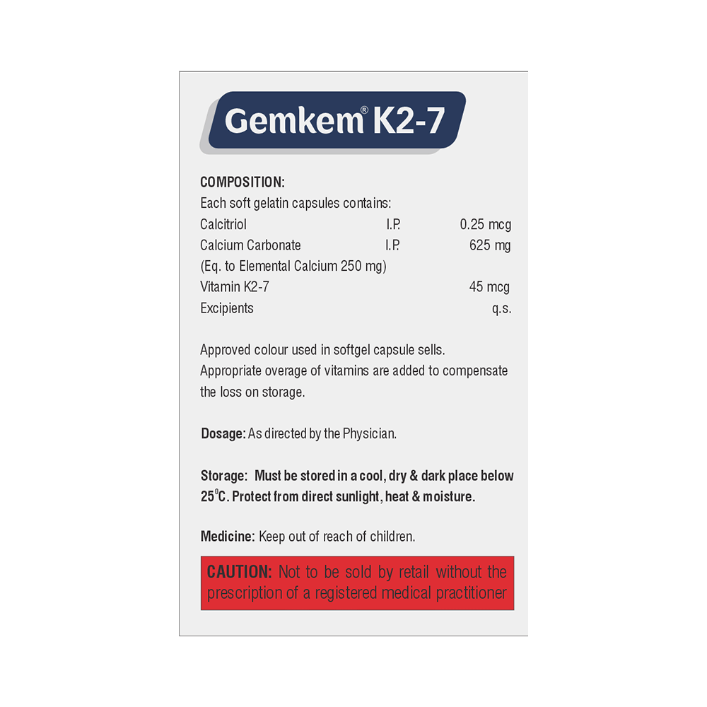 Gemkem K 2-7 Softgel Capsule is a combination of Calcitriol, Calcium Carbonate, and Vitamin K2-7. Calcitriol is the active form of Vitamin D. It raises Vitamin D levels in your blood. This in turn raises calcium levels in your blood by helping you absorb more calcium from your intestine. Calcium carbonate is a dietary supplement used when the amount of calcium taken in the diet is not enough. Vitamin K2-7 plays a central role in the metabolism of calcium, the main mineral found in your bones and teeth. Vitamin K2-7 activates the calcium-binding actions of two proteins : matrix GLA protein and osteocalcin, which help to build and maintain bone health.