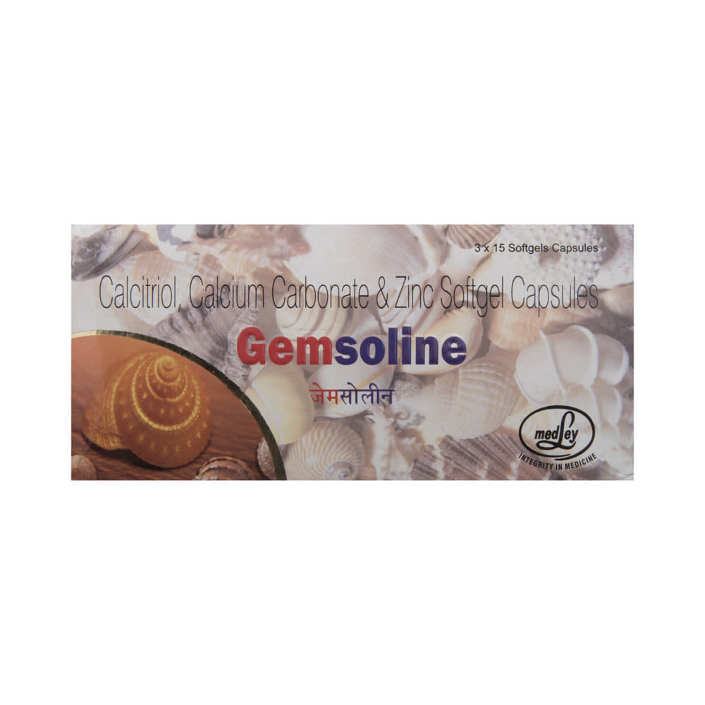 Gemsoline Soft Gelatin Capsule from Medley for Bone, Joint and Muscle Care is a combination of medicines that is used to treat nutritional deficiencies. It helps in the absorption of calcium and bone strengthening. It helps in proper growth and development of bones. It also helps in protein synthesis and the production of blood cells (red and white blood cells). Gemsoline Soft Gelatin Capsule from Medley for Bone, Joint and Muscle Care may be taken with or without food. It should be used in the dose and duration as prescribed by your doctor. It is advised to take this medicine at a fixed time.This medicine should not be taken more than the recommended dose. It is usually a safe medicine with very minimal or no side effects. However, if you experience severe diarrhea, vomiting, or constipation, you should consult your doctor without delay.Before taking this medicine, tell your doctor if you have any other health conditions. Inform your doctor if you are taking any other medicines or if you are pregnant or breastfeeding. It is advised not to take alcohol after taking this medicine.