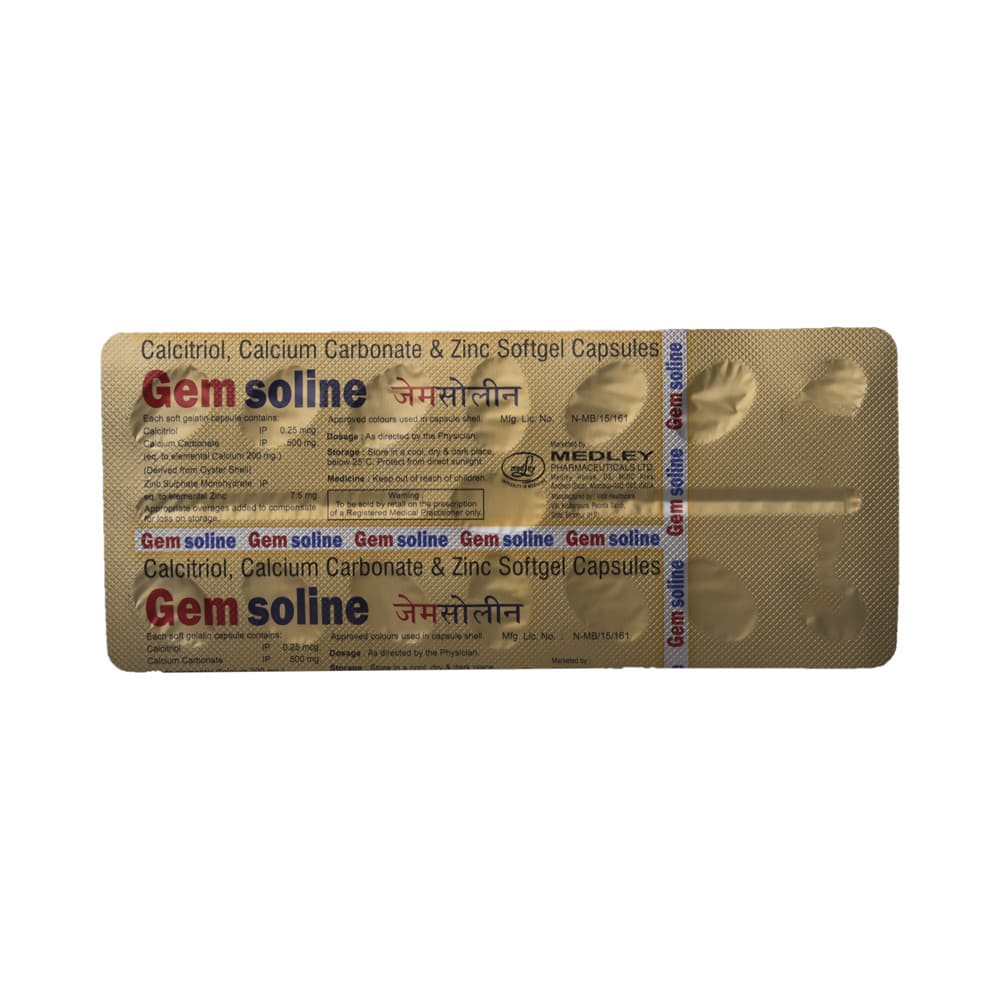 Gemsoline Soft Gelatin Capsule from Medley for Bone, Joint and Muscle Care is a combination of three medicines: Calcitriol, Calcium Carbonate and Zinc Sulfate which treat osteoporosis. Calcitriol helps your body effectively absorb Calcium Carbonate and additionally supports the muscles needed to avoid falls. Calcium Carbonate and Zinc Sulfate help build and maintain bones.