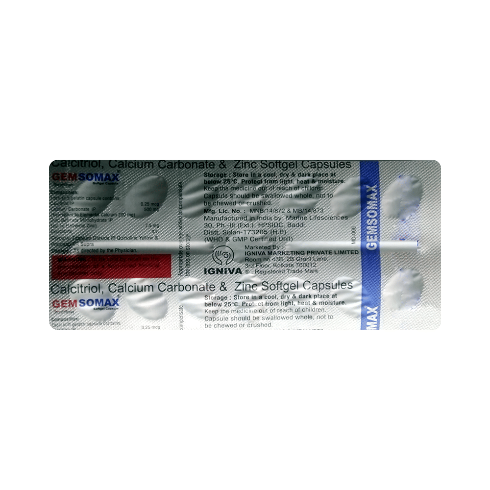 Gemsomax Softgel Capsule is a combination of three medicines: Calcitriol, Calcium Carbonate and Zinc Sulfate which treat osteoporosis. Calcitriol helps your body effectively absorb Calcium Carbonate and additionally supports the muscles needed to avoid falls. Calcium Carbonate and Zinc Sulfate help build and maintain bones.