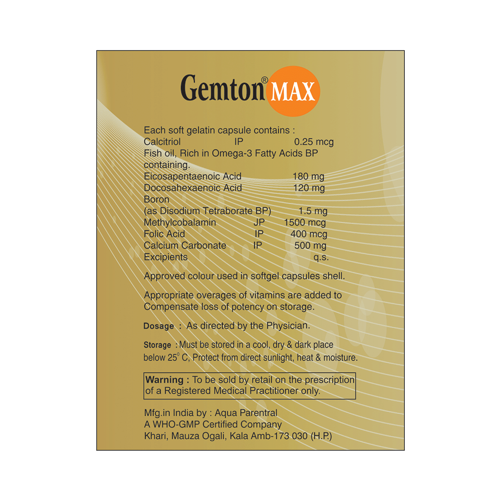 Gemton Max Softgel Capsule is a combination medicine used in the treatment of nutritional deficiencies such as low blood calcium levels. It helps in the proper growth and development of cells and brain It also promote healthy bones, muscles, nervous system, and heart. Gemton Max Softgel Capsule can be taken with or without food. It is advised to consume plenty of water with this medicine to avoid dehydration. It should be used in the dose and duration as prescribed by your doctor. It is advised to take this medicine at a fixed time. This medicine should not be taken in more than the recommended dose.This is usually a safe medicine with very minimal side effects. Some common side effects include nausea, diarrhea, constipation, fatigue, and pain in upper abdomen. Contact your doctor immediately if you notice any symptoms of allergic reactions like swelling, itching, difficulty in breathing, hives, etc.Before taking this medicine, tell your doctor if you have any other health conditions like kidney diseases as dose adjustment may be required. Inform your doctor if you are taking any other medicines or if you are pregnant or breastfeeding. It is advised not to consume alcohol after taking this medicine.