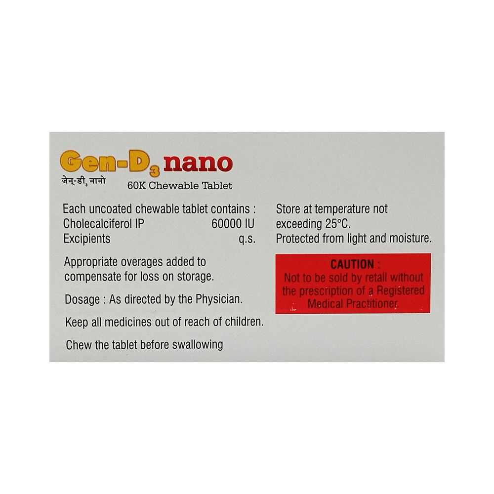 Use it as advised by your doctor or check the label for directions before use. Take this medication by mouth. Chew it completely before swallowing, or as directed by your doctor. Gen-D3 Nano 60K Chewable Tablet is to be taken with food.