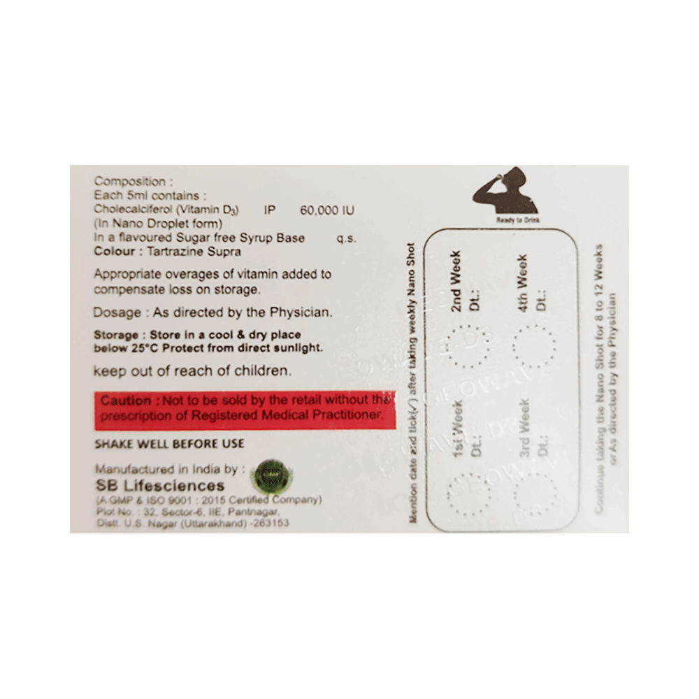 Geowave-D3 Nano Shot (5ml Each) Mango Sugar Free is used in the treatment of vitamin D deficiency and osteoporosis. It helps the body to absorb calcium. Calcium is essential for maintaining strong and healthy bones. It is used when your diet does not provide enough calcium. Geowave-D3 Nano Shot (5ml Each) Mango Sugar Free should be taken as directed by your doctor. It is best taken with or after food, as this helps your body absorb it, and you should take it regularly to get the most benefits. If you are using it to treat osteoporosis, you will also be prescribed other medicines. This medicine may be only part of a complete treatment program that includes making changes to your diet and taking calcium and vitamin supplements. Learn about the foods you should eat to ensure you get enough calcium and vitamin D.Geowave-D3 Nano Shot (5ml Each) Mango Sugar Free has few side effects, and none are common. If you take too much, you may feel weakness, muscle pain, or a metallic taste in your mouth. If you experience any such side effects, speak with your doctor. They may be able to help you reduce or treat the symptoms.Before taking this medicine, tell your doctor if you have high calcium levels in your blood or if you have any heart, kidney, or liver disease. Some other medicines can decrease the absorption of vitamin D3, so let your doctor know about all the other medicines you are taking to make sure you are safe. This medicine may help during pregnancy when your body needs more vitamin D, but too much could harm your baby. Discuss it with your doctor.