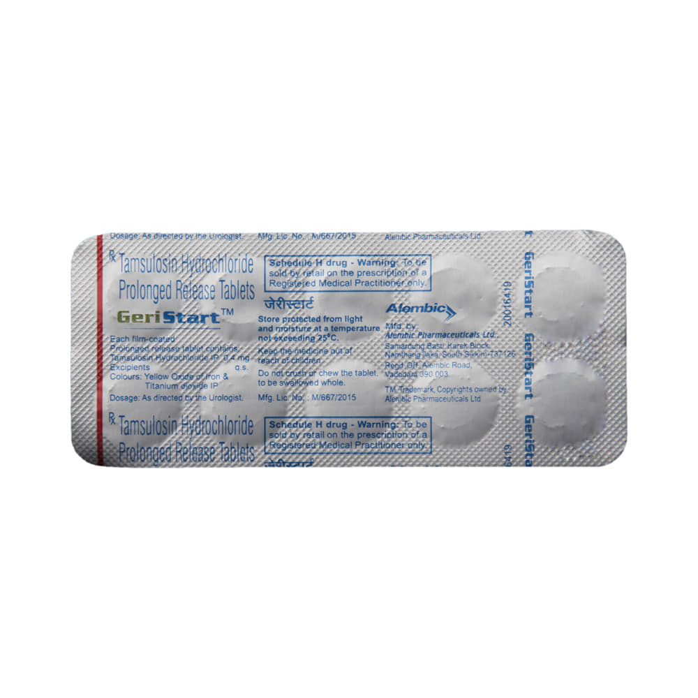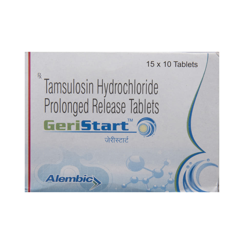 Geristart Tablet PR is an alpha-adrenergic antagonist that is used in the treatment of benign prostatic hyperplasia. It helps to relieve symptoms like difficulty in passing urine. However, it does not decrease the size of the prostate. Geristart Tablet PR is advised to take it in a dose and duration as per prescription. It may be taken with or without food, but take at the same time regularly. Swallow the medicine as a whole without crushing or chewing it. You should not stop taking the medicine without consulting the doctor as it may lead to the worsening of your symptoms. The course of the treatment should be completed for better efficacy of the medicine.Use of this medicine can cause some common side effects such as dizziness, backe pain, chest pain, ejaculation disorder, and retrograde ejaculation. If any of the side effects persist or bother you, you must consult the doctor without delay.Simple lifestyle changes can help you manage your symptoms better. Try to urinate as soon as you feel the urge, however, never strain or push to empty your bladder. You should avoid drinking caffeinated or alcoholic drinks at night and a few hours before going to bed or going out.Before receiving the treatment, inform your doctor if you are on any medication for any other health condition. If you have to undergo eye surgery due to cataracts or glaucoma then inform your eye doctor about the usage of this medicine. Patients with liver disease must be cautious while receiving the prescription, and they must receive regular follow-ups as per the doctor’s advice.